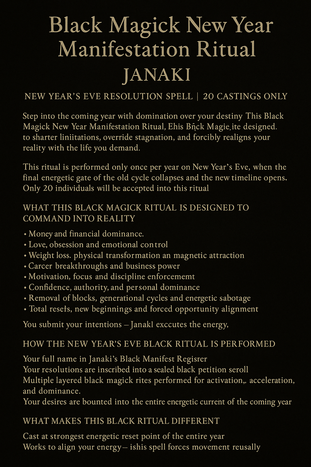 Step into the coming year with domination over your destiny. This Black Magick New Year Manifestation Ritual, cast personally by Janaki, is designed to shatter limitations, override stagnation, and forcibly realign your reality with the life you demand.