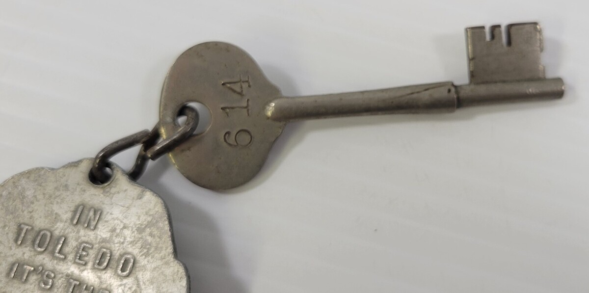 *B52) Vintage Secor Hotel Toledo Ohio Skeleton Room # 614 Key Metal Fob