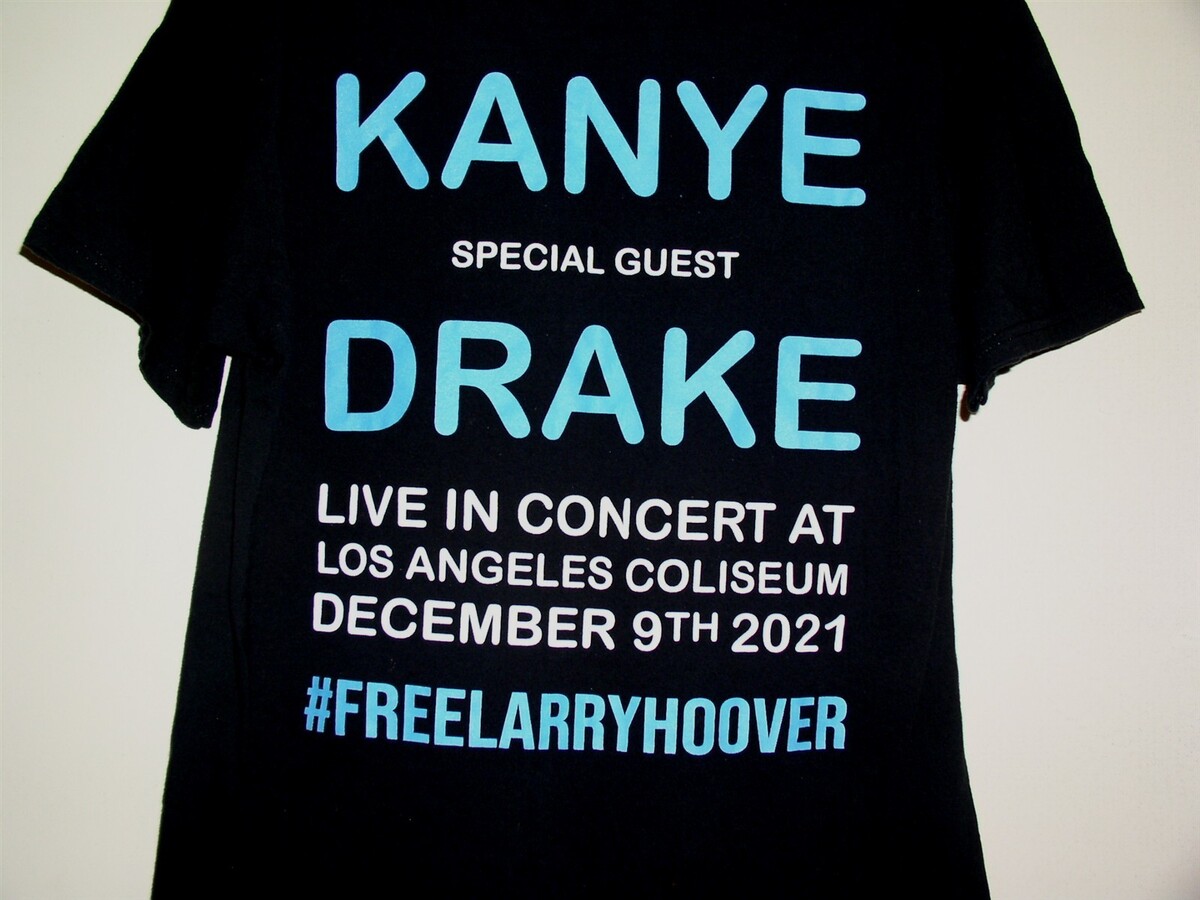 This is a Kanye West and Drake concert t shirt entitled, "Kanye Special Guest Drake Los Angeles Coliseum December 9th 2021". This is a Free Larry Hoover benefit event concert. Tag reads: Fruit Of The Loom HD Cotton. A terrific item for the fan or collector.