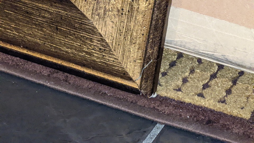 Note that the frame is damaged in the bottom corners. This will show somewhat when hung. You could easily mend it with a bit of plaster or just reframe.