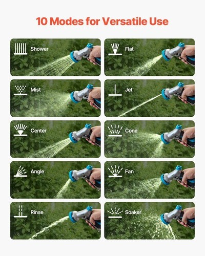 10 Spray Modes: The unique rotating spray head provides 10 different modes, including a powerful wash and gentle shower. The garden hose nozzle can easily handle tasks like car washing, garden watering, and general cleaning, enhancing both efficiency and enjoyment.