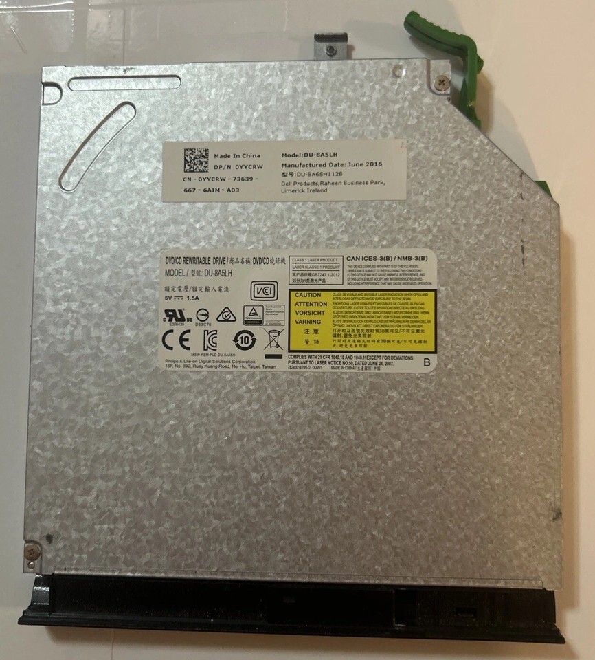 This is a genuine Dell DU-8A5LH DVD/CD Rewritable Drive with Dell Part Number 0YYCRW. It is a multi-colored drive with Mini SATA connectivity, manufactured in 2016. The drive has dimensions of 5.50 inches in length, 5 inches in width, and 0.375 inches in height. It is designed for use in computers or other electronic devices that require a DVD/CD rewritable drive.