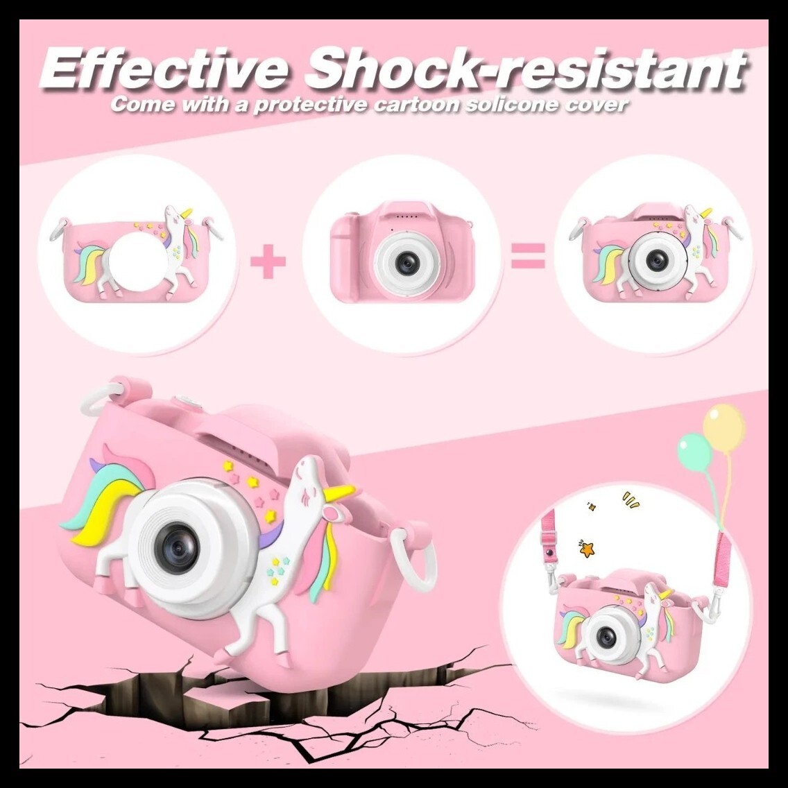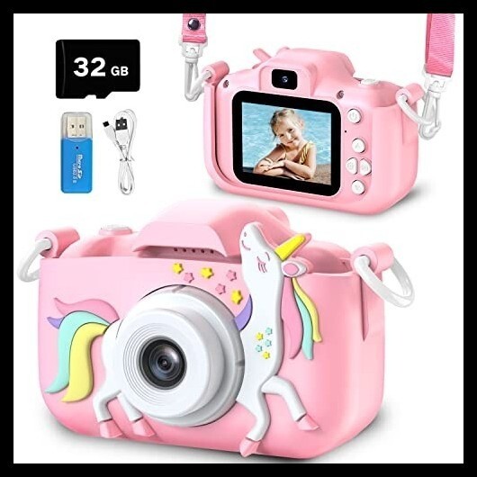 1x Kids Camera with Cartoon Protective, 1x Exquisite packing box, 1x USB Charging Cable, 1x 32GB Memory Card, 1xCard reader, 1x Hanging Lanyard, 1x User manual