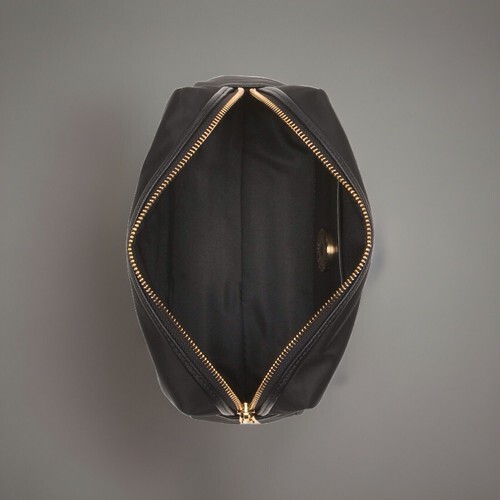 Brand logo accent, gold tone hardware, fully lined interior
