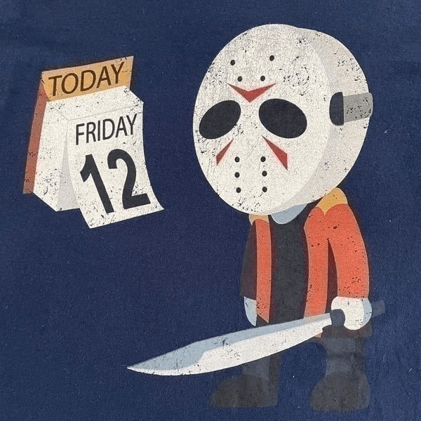 Friday the 12th? Or Friday the 13th! This humorous Jason Halloween themed graphic T-shirt is dark blue and a men?s size large, measuring 18 inches from shoulder to hem and 21 inches from armpit to armpit. The graphic is intentionally distressed but there is some crackling from wear. Nothing major. See photos.
