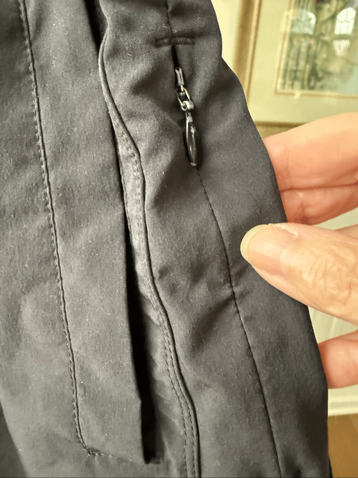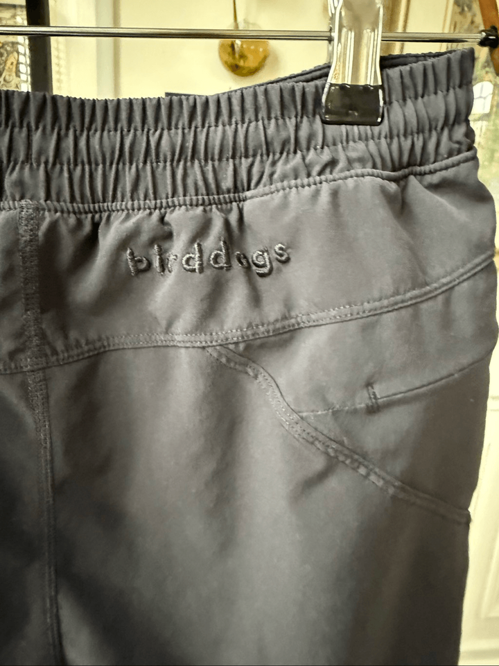 Birddogs boom stick for your broomstick black stretchy pull on shorts that are the perfect convergence of comfortable athletic wear and polished shorts. Faux fly. These are stretchy athletic fabric within elastic waist. Vertical welt pockets at the hip with a secure zipper pockets running vertically next to one. A secure zipper pocket at the back. Bird dogs embroidered in black at the back waistband with the bird dog logo at the back hem. Faux fly. Tag size medium with a 7 inseam. $78 retail.