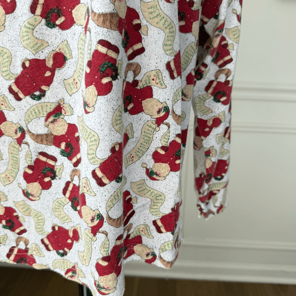 Vintage cornerstone cotton and poly blend turtleneck with all over embroidered Santa, checking his naughty or nice list pattern in res and green on white. Laying flat measures 27 inches shoulder to hem and 23? armpit to armpit.