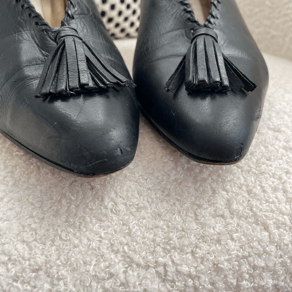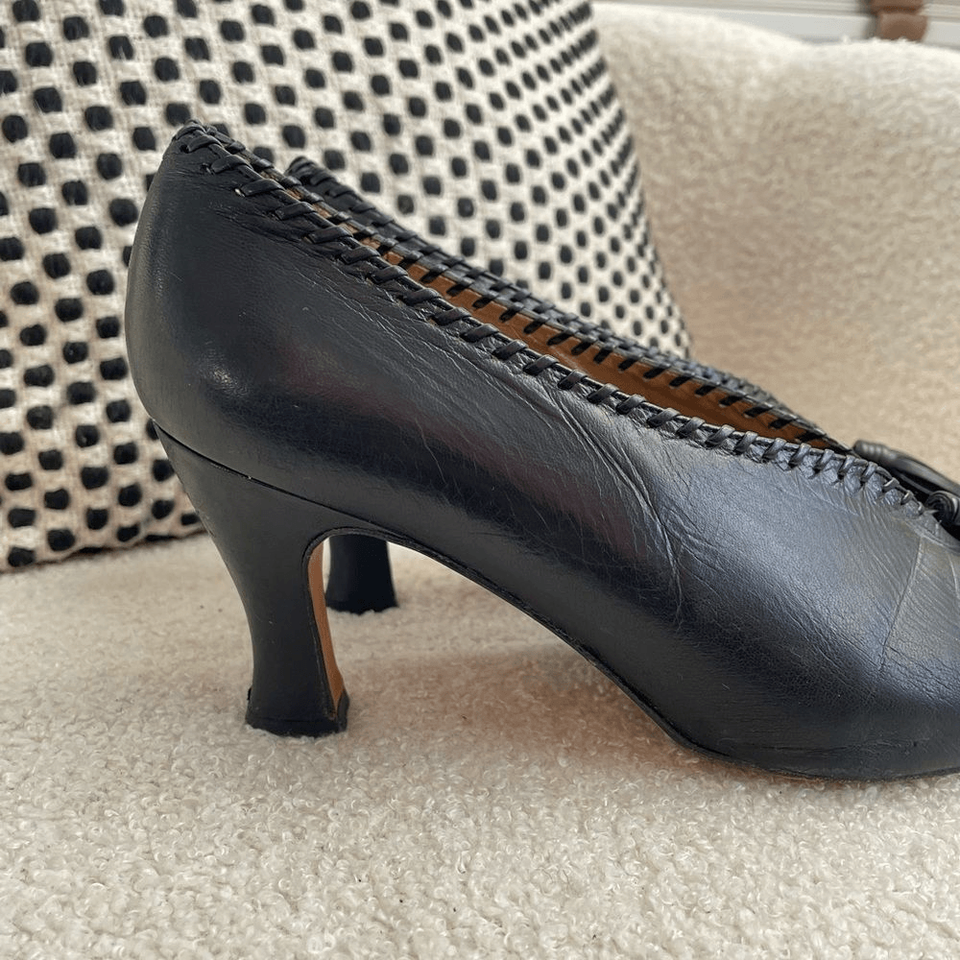 Vintage High Cut Evan Picone Black Leather Tassel Whipstitch Heels Shoes 9.5
