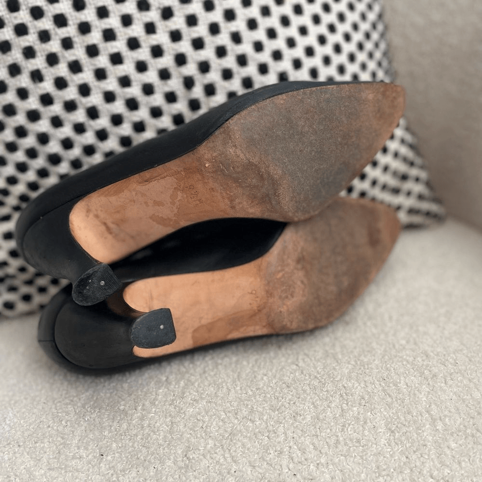 Vintage Evan Picone leather heels. The silhouette is high cut with whipstitch trim and tassels. The leather is soft and pliable, not stiff. Curved 1920s style heel that made a popular come back in the 80s. Heel is 3 inches tall. Leather uppers and leather soles that show some pitting consistent with light wear.