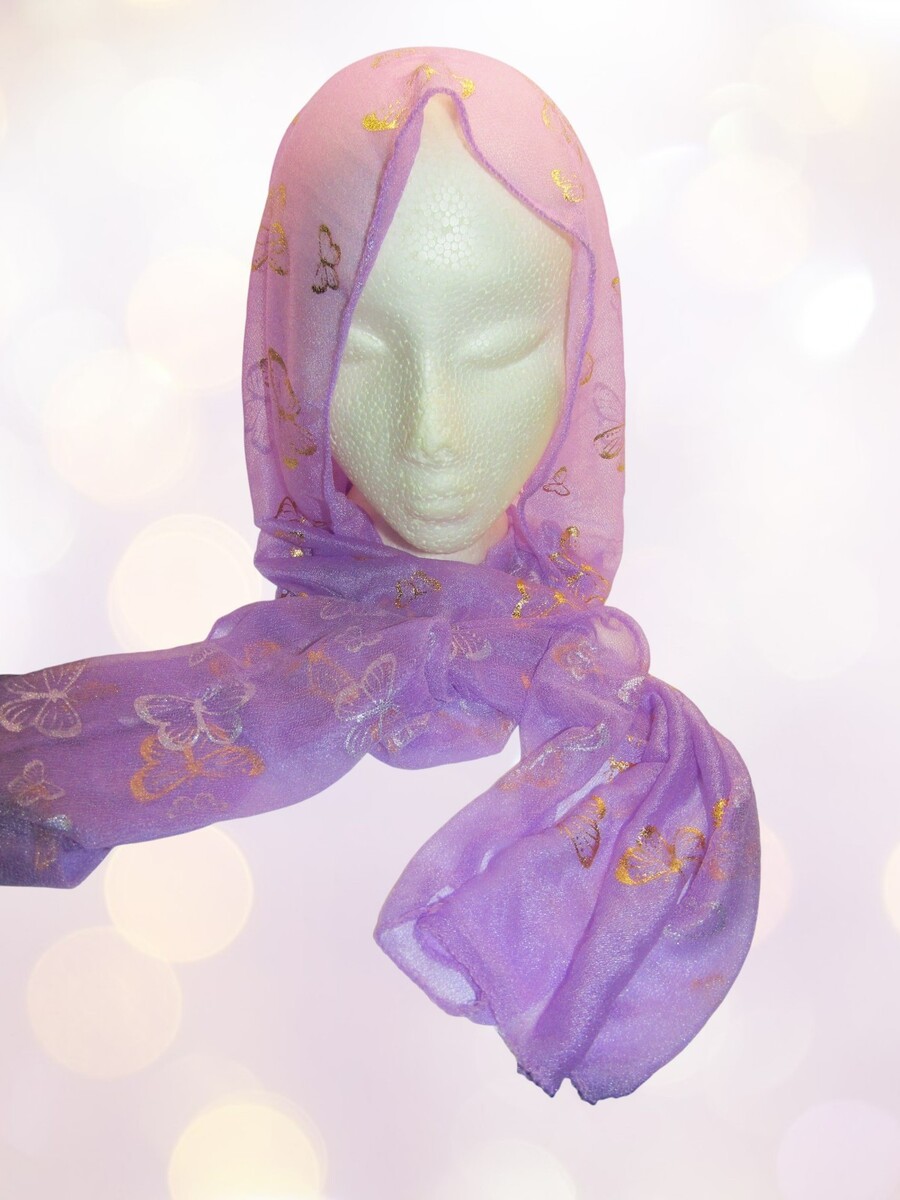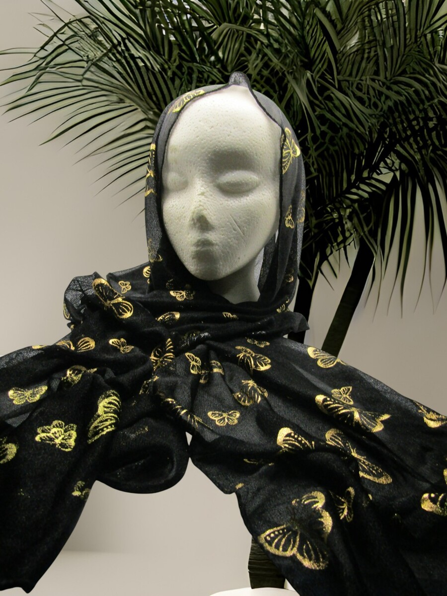 The prints include shimmering gold butterflies on sheer fabric (black, red, purple) and a vibrant floral butterfly design in pink and orange. Each style adds a touch of elegance and movement to any outfit.