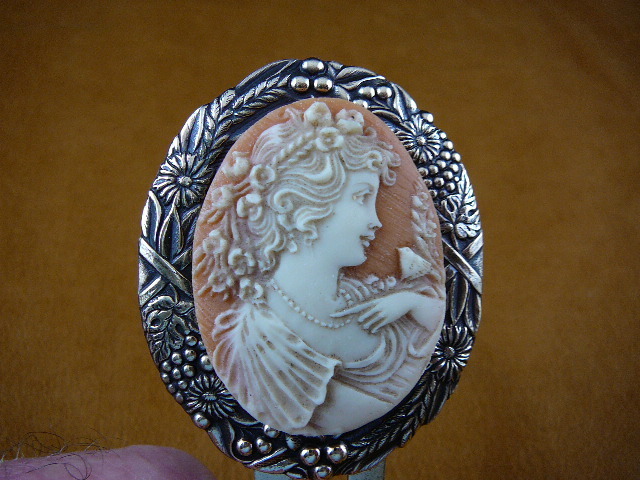 Mounted on a -duction brass hair pin; item is 5" long x 2" wide. Intended to be inserted in hair already up, as a beautiful adornment to your hair, the looks is similar to a tiara adornment. They can also be displayed as a new heirloom. It is a brass double prong 3-7/8" long, plus the added height of the pine resin cameo on a brass backing. Stunning.