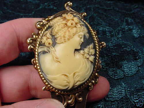 Mounted on a -duction brass hair pin; item is 5-1/8" long x 1-7/8" wide. Intended to be inserted in hair already up, as a beautiful adornment to your hair, the looks is similar to a tiara adornment. They can also be displayed as a new heirloom. Here is what the full hair pin looks like, it is a brass double prong 3-7/8" long, plus the added height of the pine resin cameo on a brass backing. Stunning.