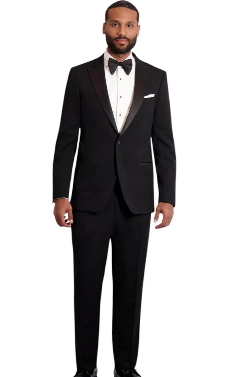 Shine in this super 120s luxury wool, magnificently tailored slim fit tuxedo by renowned designer Ike Behar. Its slim fit is flattering to all body types.