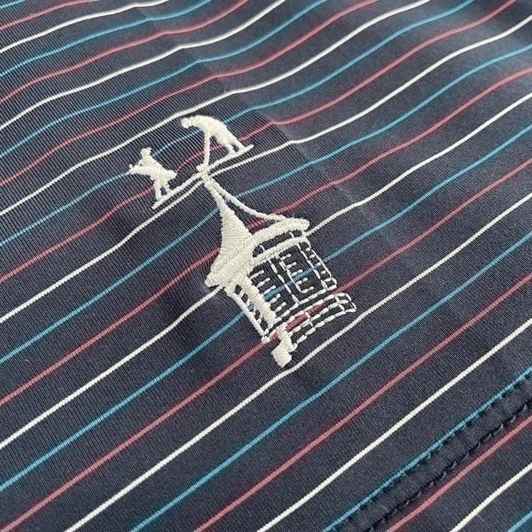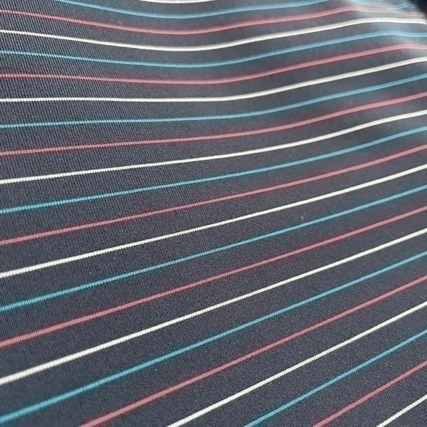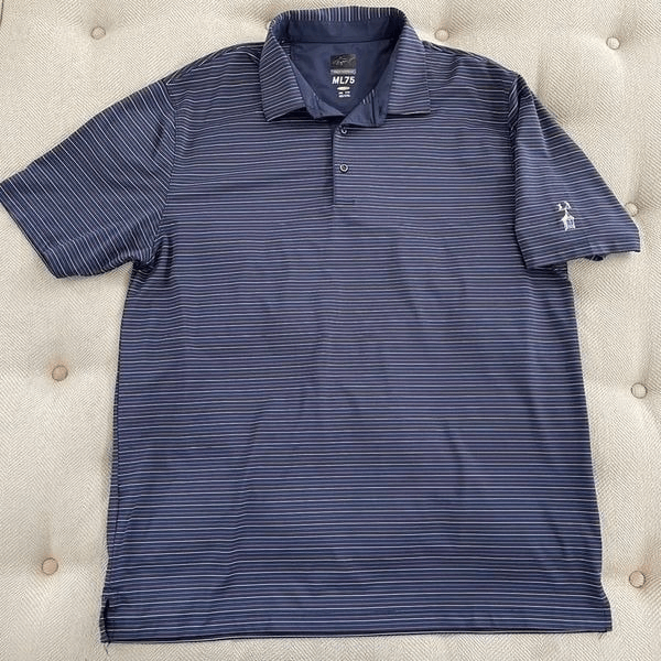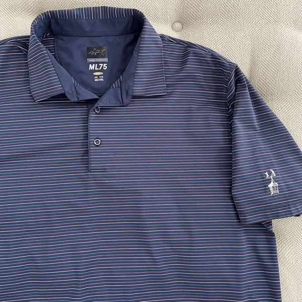 Greg Norman navy blue polo golf shirt with lighter blue, white and pink micro stripes. Made of polyester spandex performance fabric. There is an embroidered golf logo on the sleeve but I?m not sure exactly what it is for. Measurements are approximate and taken rolling flat: 32 inches from shoulder to hem and 25 inches from armpit to armpit