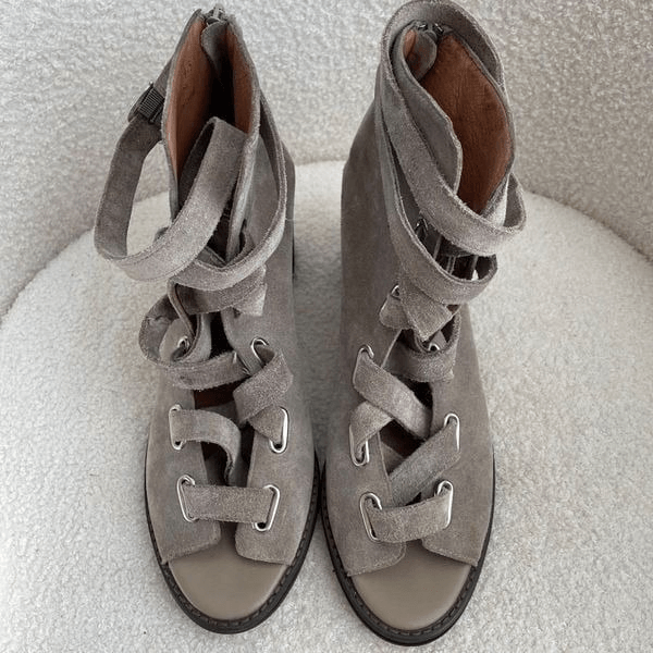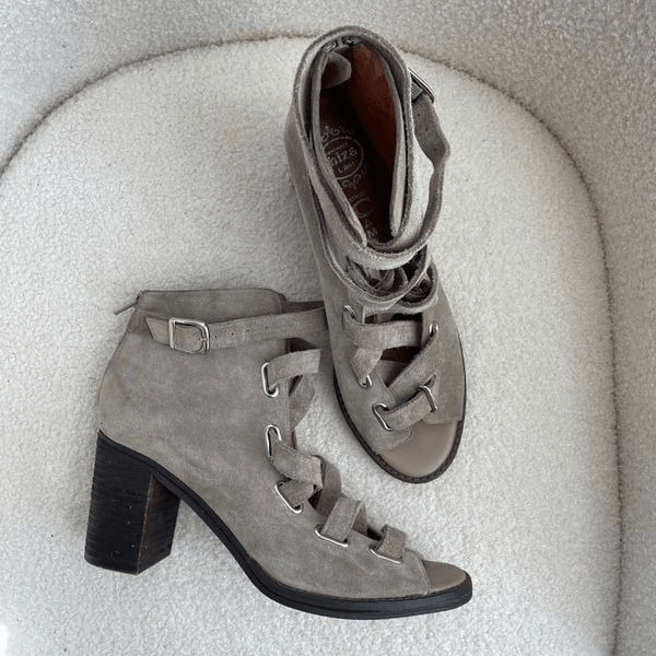 Jeffrey Campbell Salazar lace front block heel booties in a true taupe color. I think the manufactures initial color name for this shoe is gray, but I think it is definitely more tope with some cool tan undertones. Back zip for easy on off and the strap wraps around your ankle and buckles. Open toe. Suede leather. 3.25 inch heel. $178 retail
