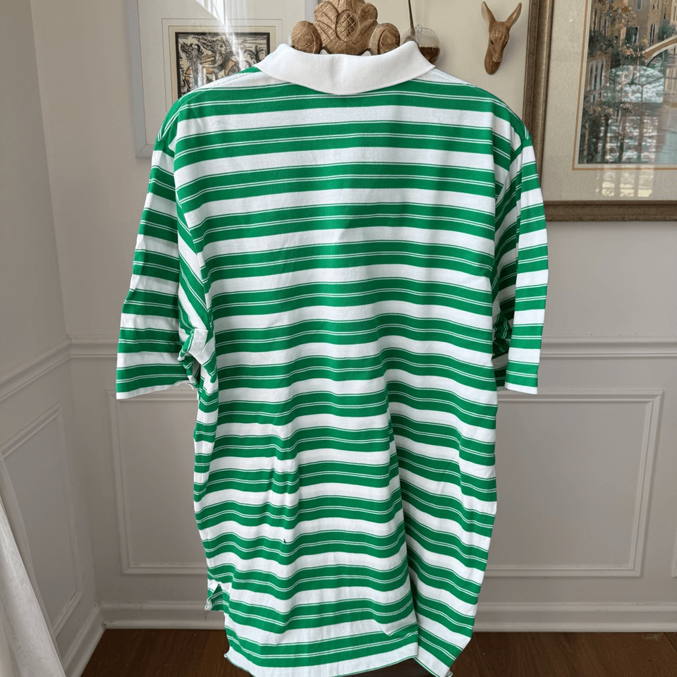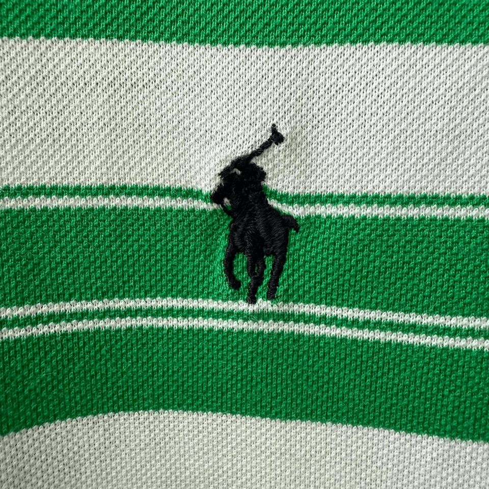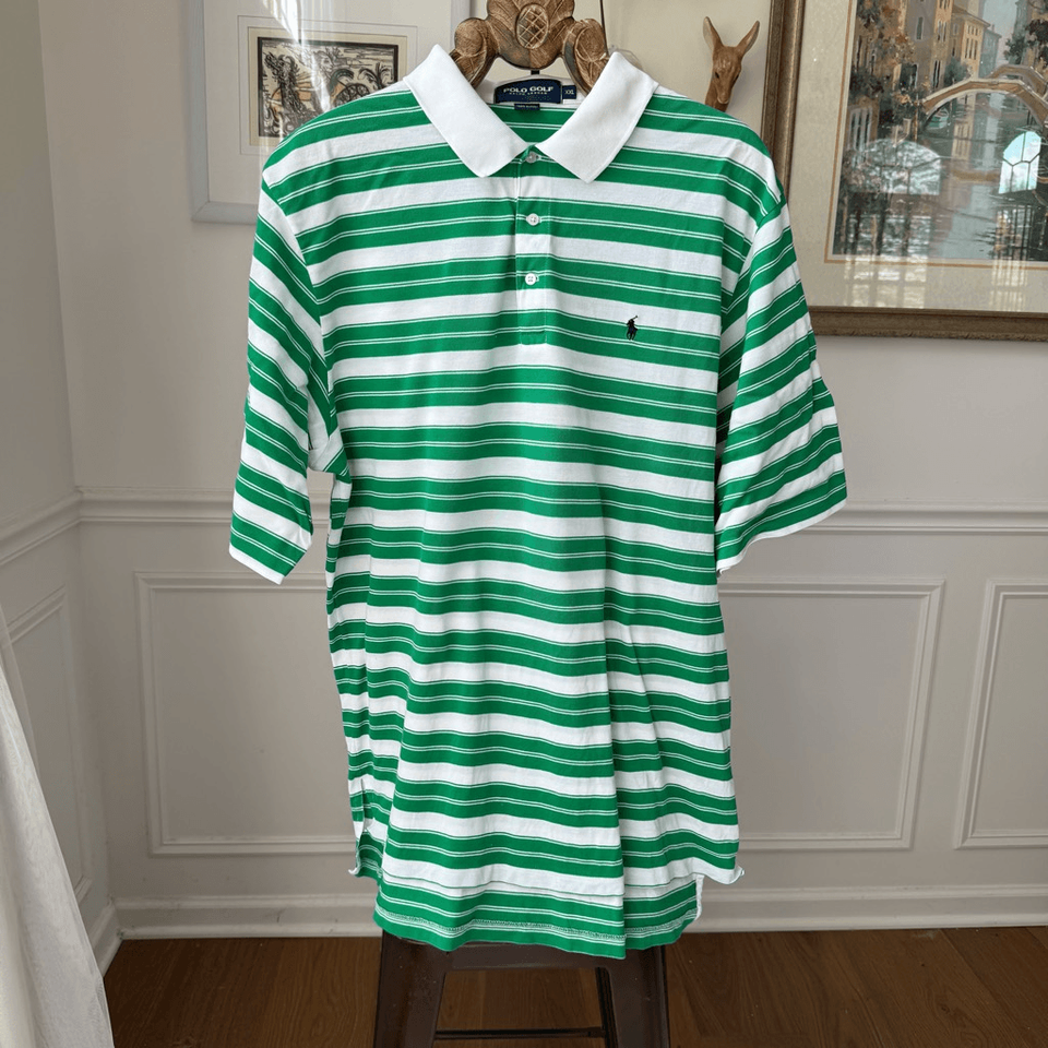 Polo golf, Ralph Lauren Kelly Green stripe 100% pique cotton golf shirt with embroidered polo pony at the chest. Laying flat measures 32 inches shoulder to hem and 26 inches armpit to armpit ??