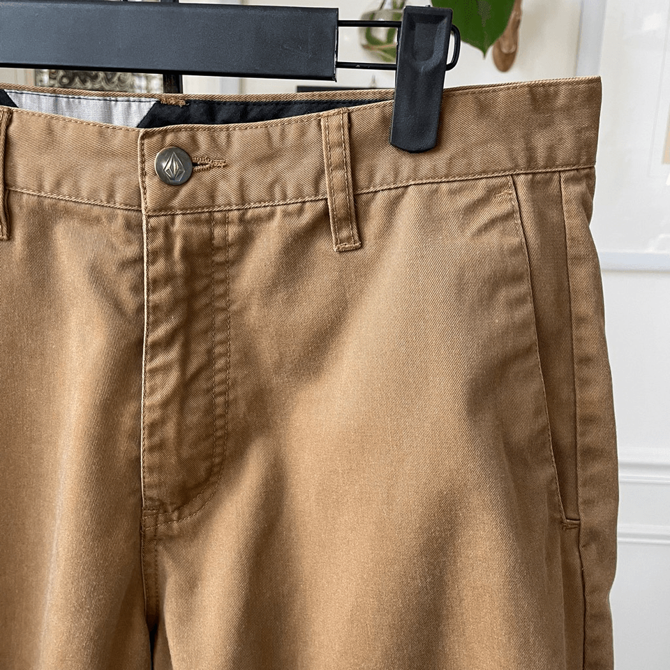 Men?s Volcom cotton and polyester blend flat front khaki shorts in dark tan color with button and zip closure. Hip pockets and two back welt pockets. Branding logo at the back hem and above the back pocket. The button closure is stamped with the Volcom logo.