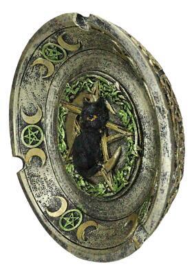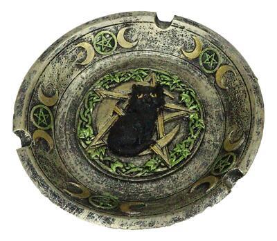 ? A mystical black cat lends its curious all seeing eyes to your domain. This dark feline has a pentagram pentastar talisman pendant on its backdrop. The ashtray dish is bordered by triple moons as well as Celtic knotworks all around.