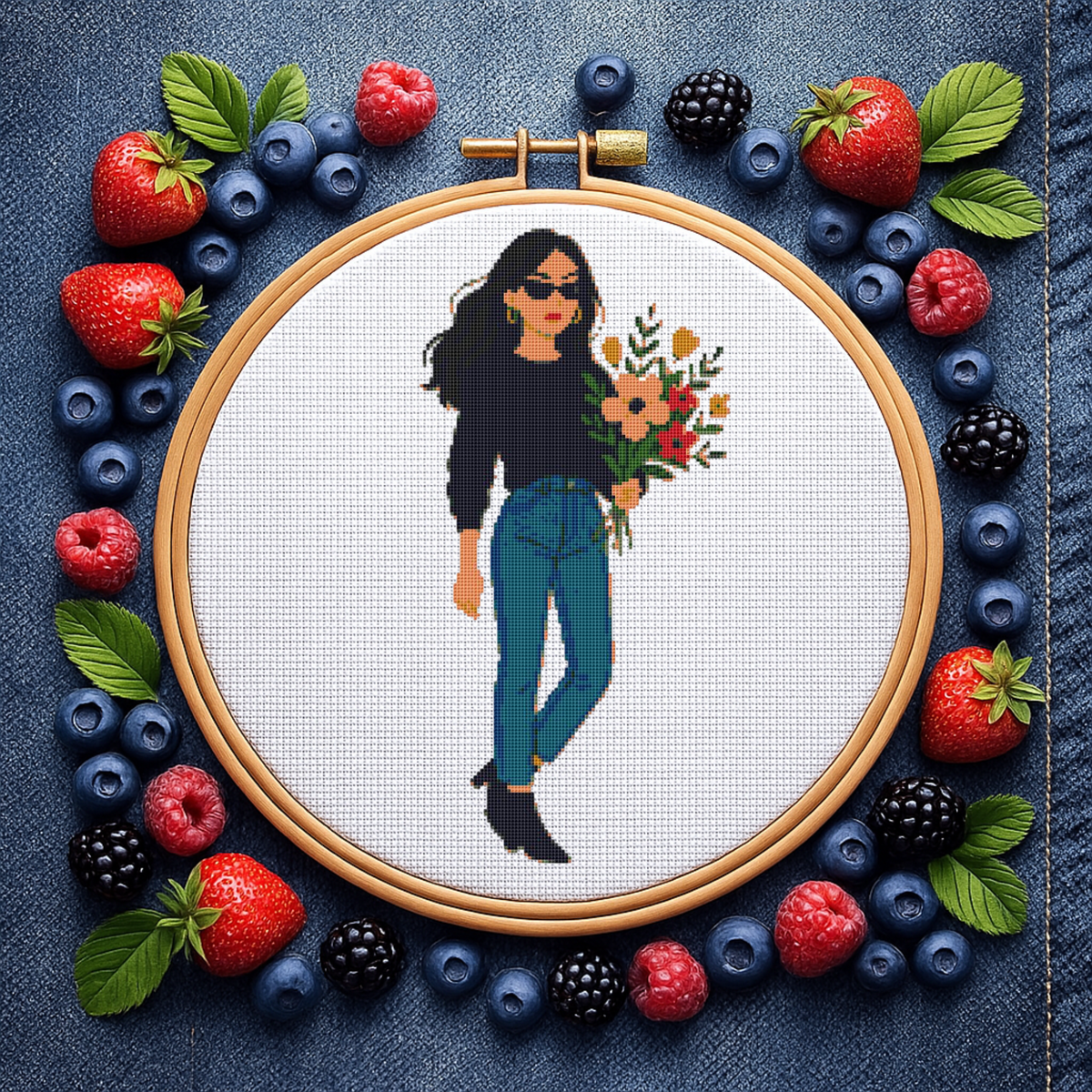 A girl in jeans and with flowers - Cross-stitch pattern, Instant download