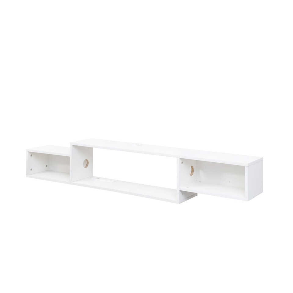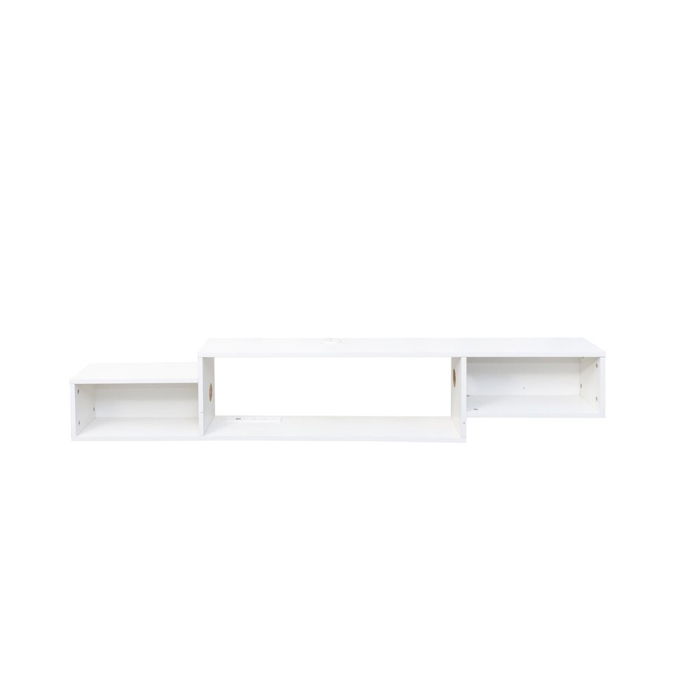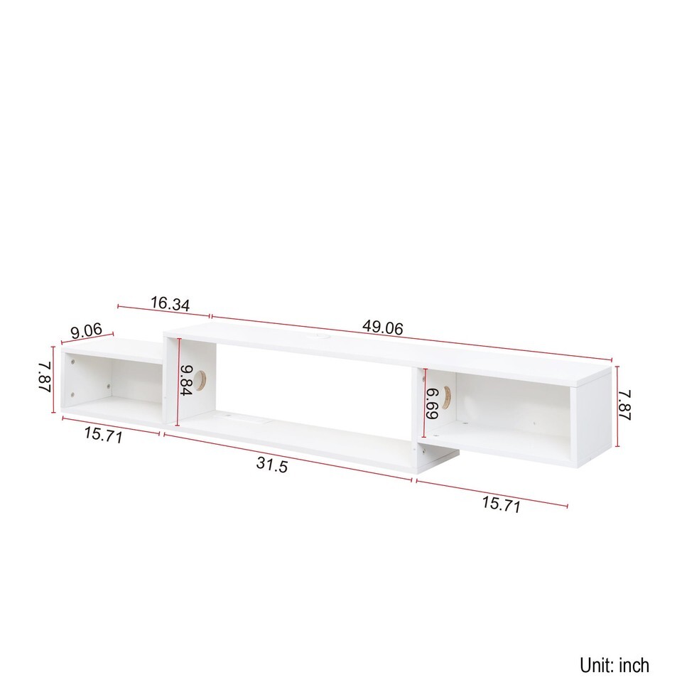 The wall mounted floating design is more stylish and space saving. Adds a modern touch to most home decorations. Please do not place the TV directly on the shelf.