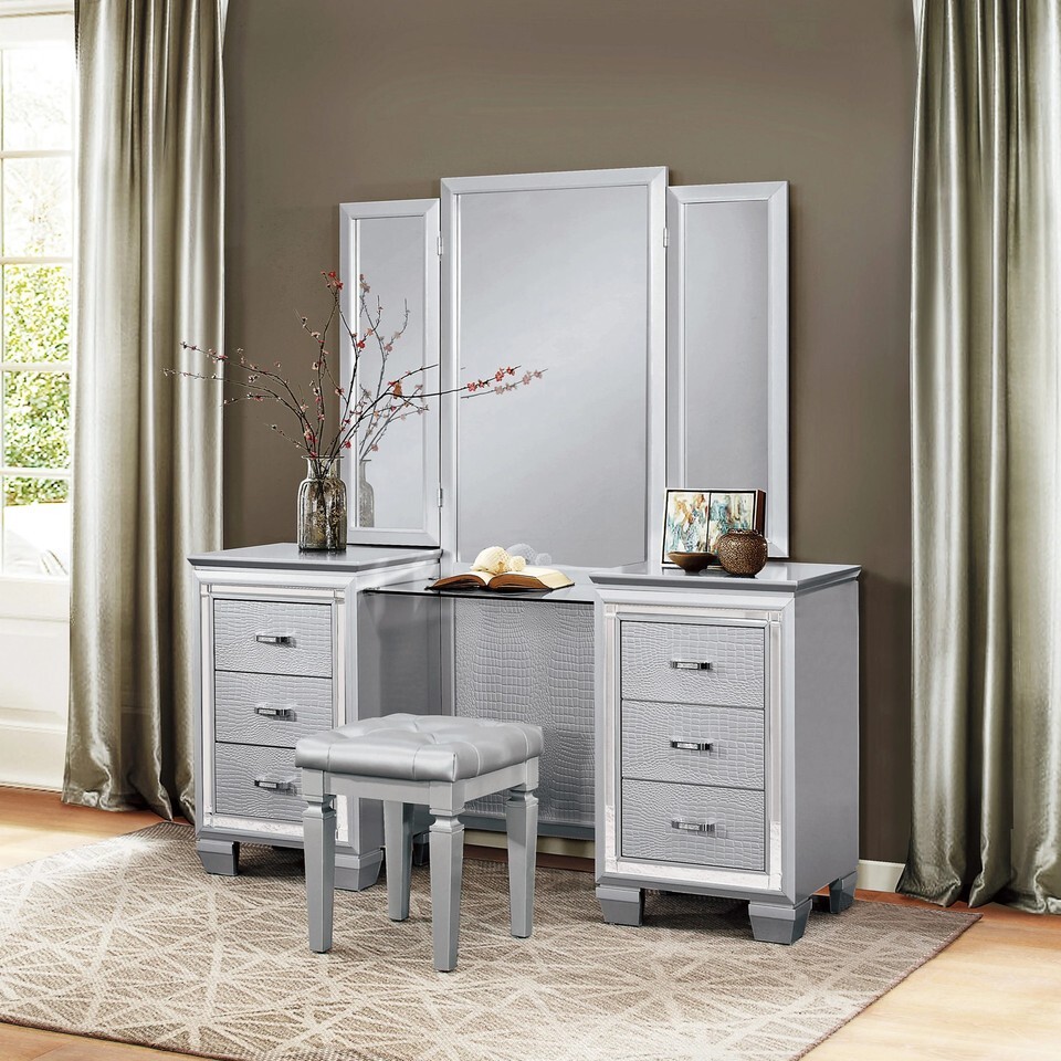 Modern Glam Silver Vanity Stool - Faux Leather Tufted Bedroom Seat