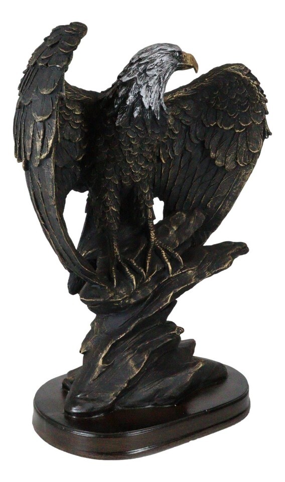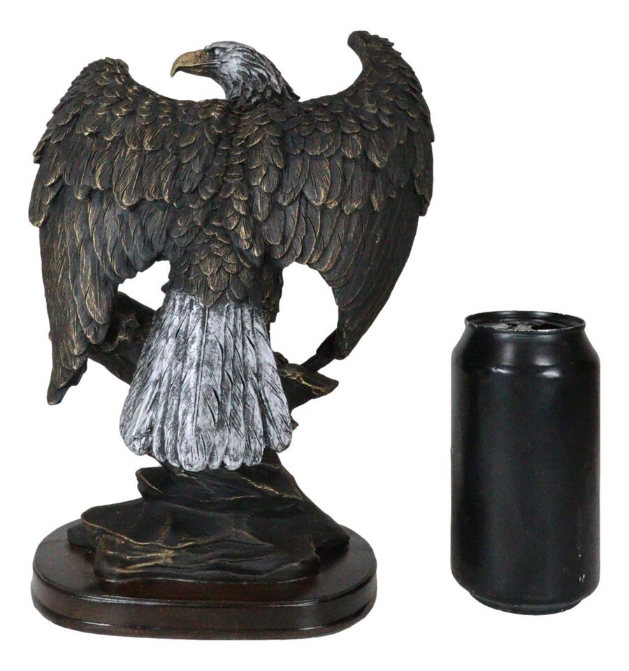 ? This Bronzed Bald Eagle On A Wooden Base statue is made of resin, hand painted and polished. Color Tone may vary from pictures.