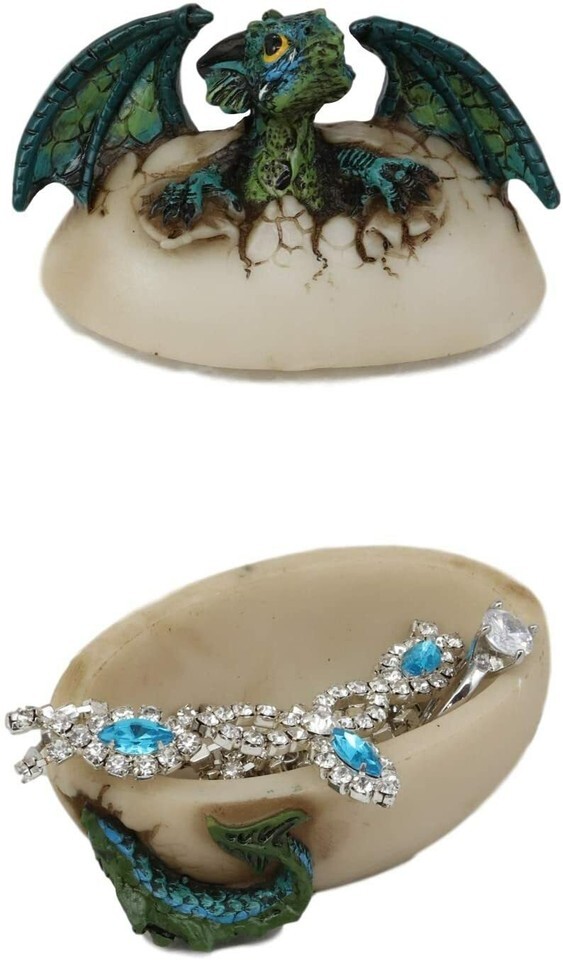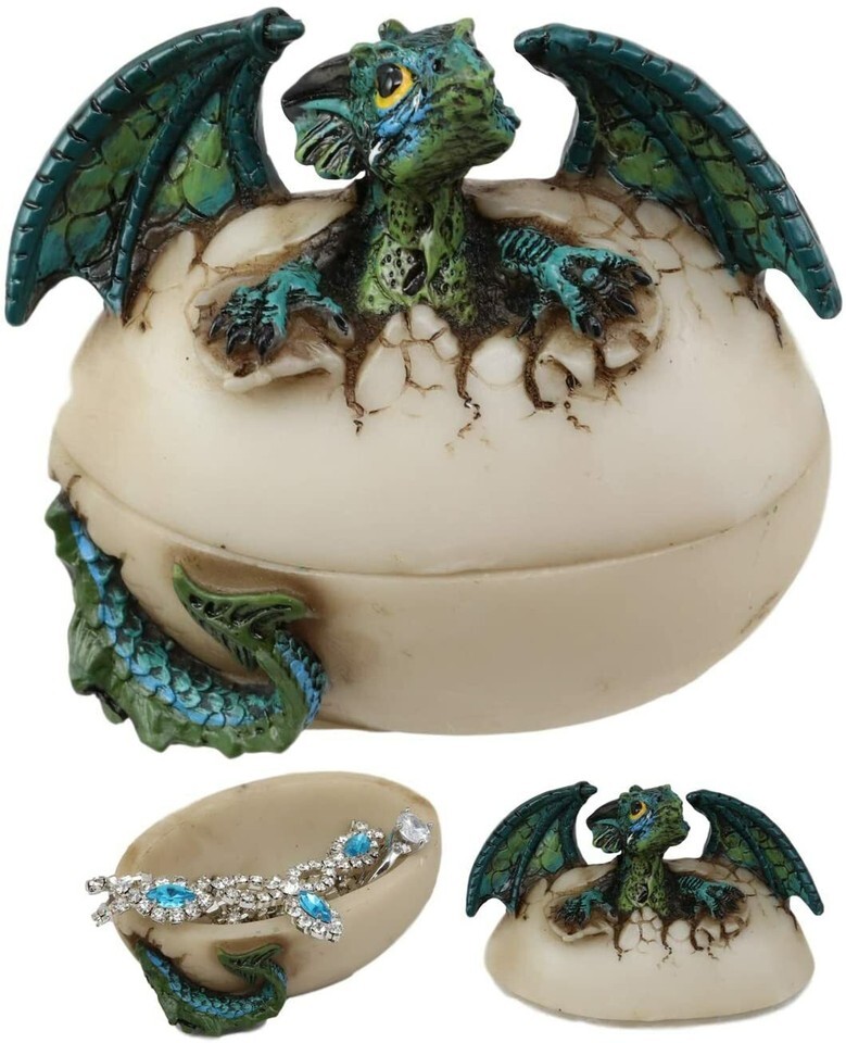 ? This Green Dragon Hatchling Egg Box figurine is made of high quality designer resin, individually handpainted and polished. Because each piece is partially hand crafted, color tone may vary from pictures.