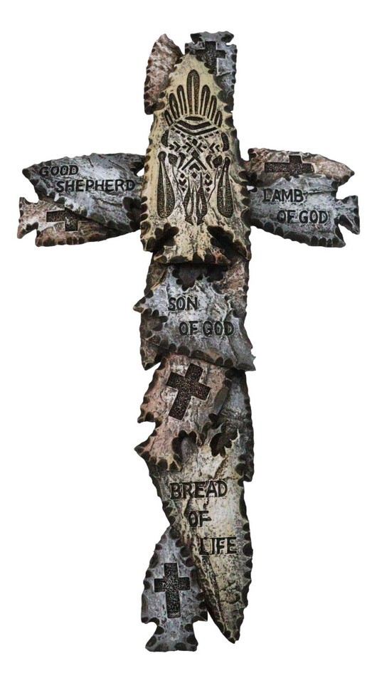 ? Celebrate faith and heritage with the Tribal Indian Faux Arrowhead Stones Wall Cross, a powerful blend of spiritual symbolism and rustic artistry. Featuring rich tribal-inspired detailing, this cross showcases faux arrowhead stones and meaningful Christian imagery, including the Lamb of God, Good Shepherd, and Bread of Life. Each element reflects the strength, sacrifice, and guidance of Christ, brought together in a design that honors both Native-inspired aesthetics and sacred scripture.