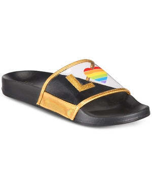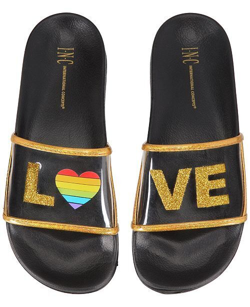 Put your feet together to find some rainbow love with these slide slippers by I.n.c. International Concepts. Put your feet together to find some rainbow love with these slide slippers by I.N.C. International Concepts. Womens Shoe Size Conversion: S: 5/6, M: 7/8, L: 9/10, XL: 11/12 Slip-on design LOVE written across both shoes, with the O being a rainbow heart NOTE: Designed for indoor use only PVC Spot clean with damp cloth Imported