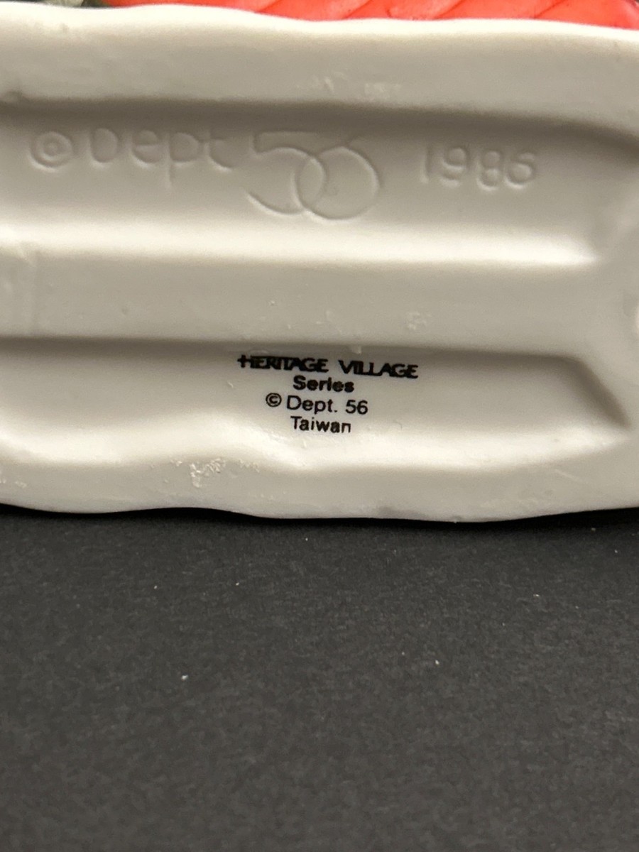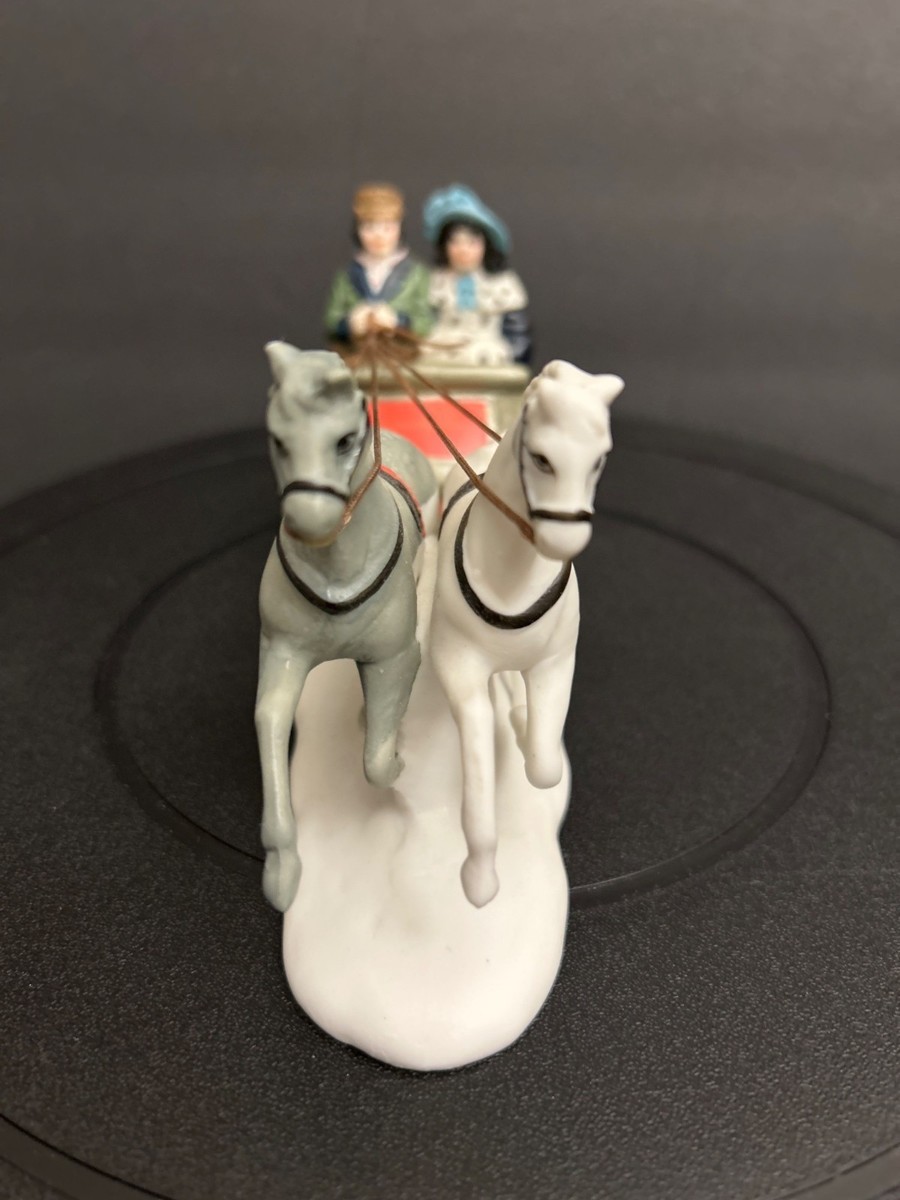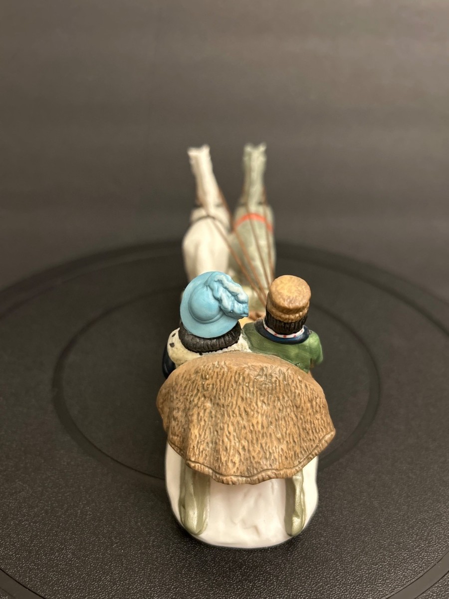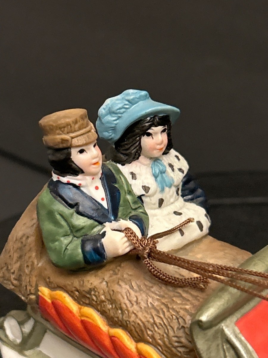 In the wintery wonderland of Heritage Village, a joyful couple rides through the snow in a vibrant red sleigh drawn by gallant horses. Crafted in 1985 with finely detailed porcelain, this piece captures the charm of nostalgia, adding warmth and festive spirit to holiday displays.