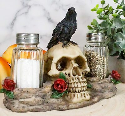 Ebros Day Of The Dead Raven Crow W/ Rose Skull Salt & Pepper Shakers Holder Set