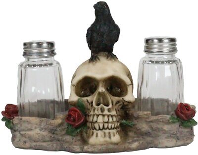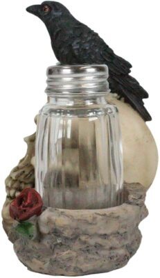 ? This Raven Skull Salt Pepper Shakers Holder figurine is made of designer composite resin, hand painted and polished. Color Tone may vary. Glass shakers included but the condiments are not.