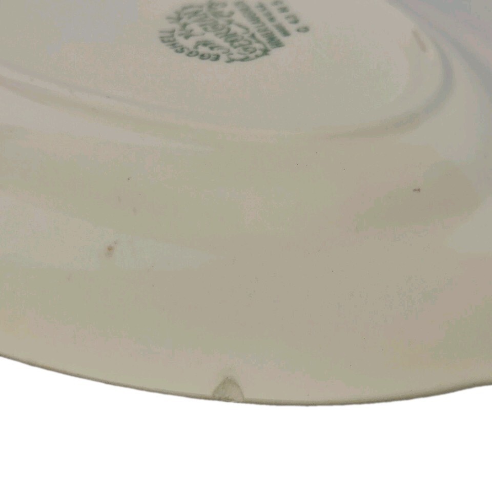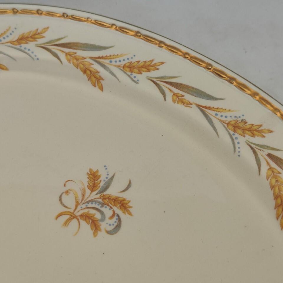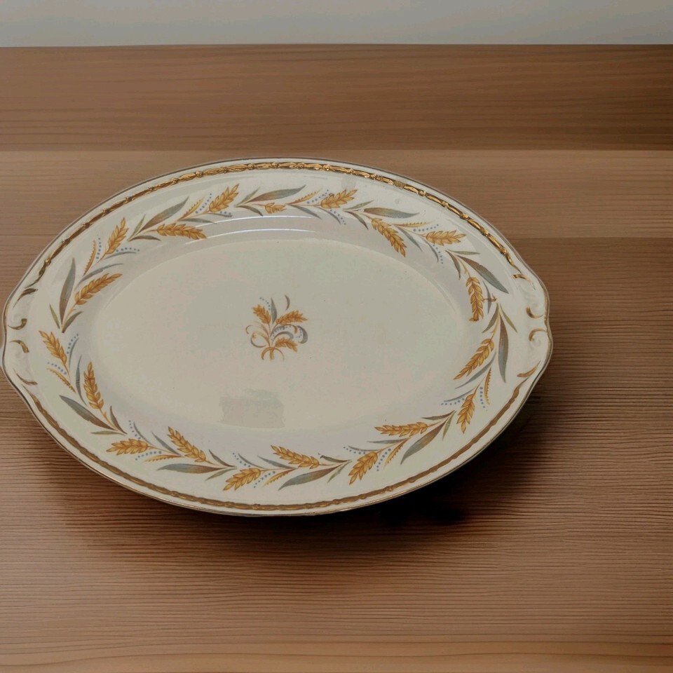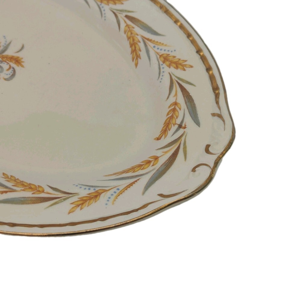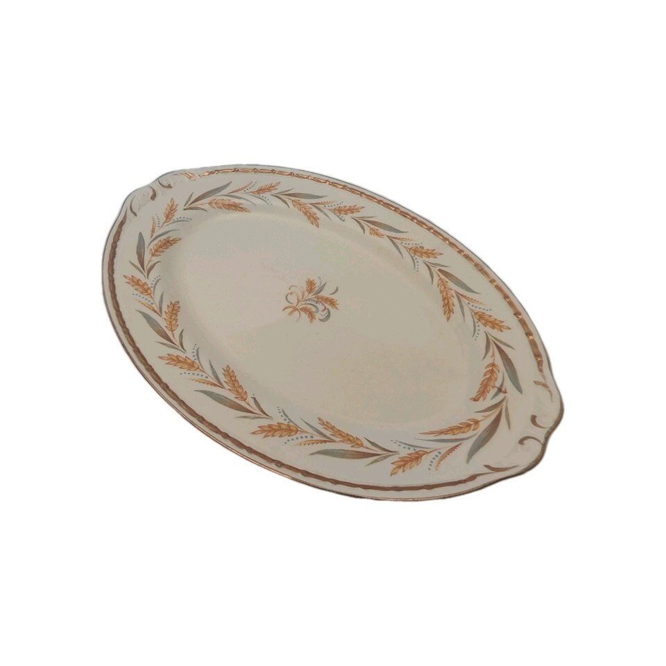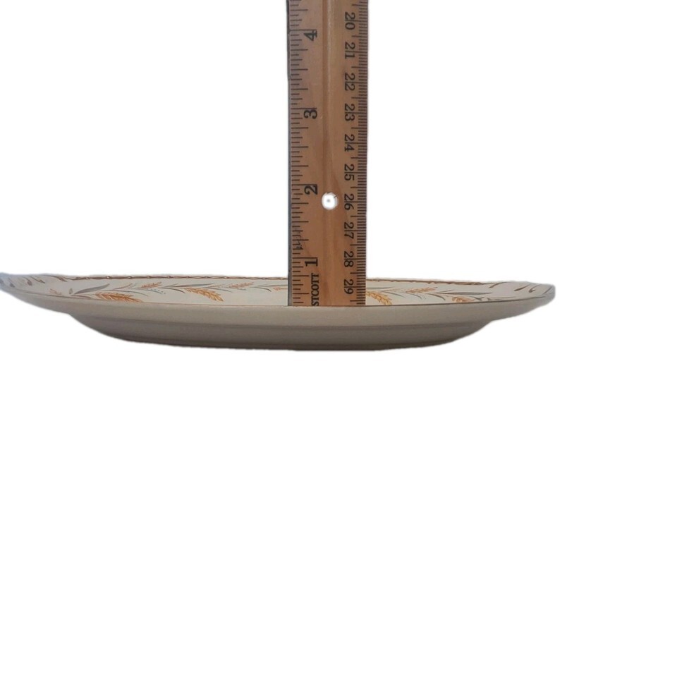 The Homer Laughlin Kingston Wheat Eggshell Georgian 8 3/4" Platter Relish Plate is a vintage ceramic piece originating from America in the 1940s. This oval shaped platter features a multicolor Kingston Wheat pattern, falling under the Georgian style. Manufactured by Homer Laughlin in the United States, this printed backstamp piece weighs 10 oz, making it a unique and decorative addition to any collection of pottery and glass. Has a small chip on the underside of plate see pics