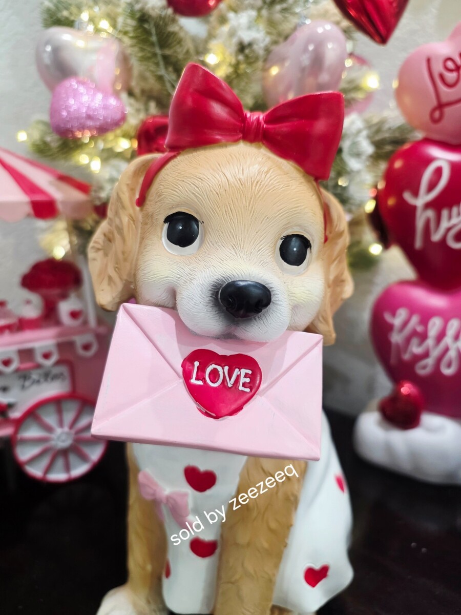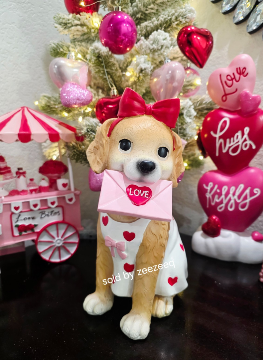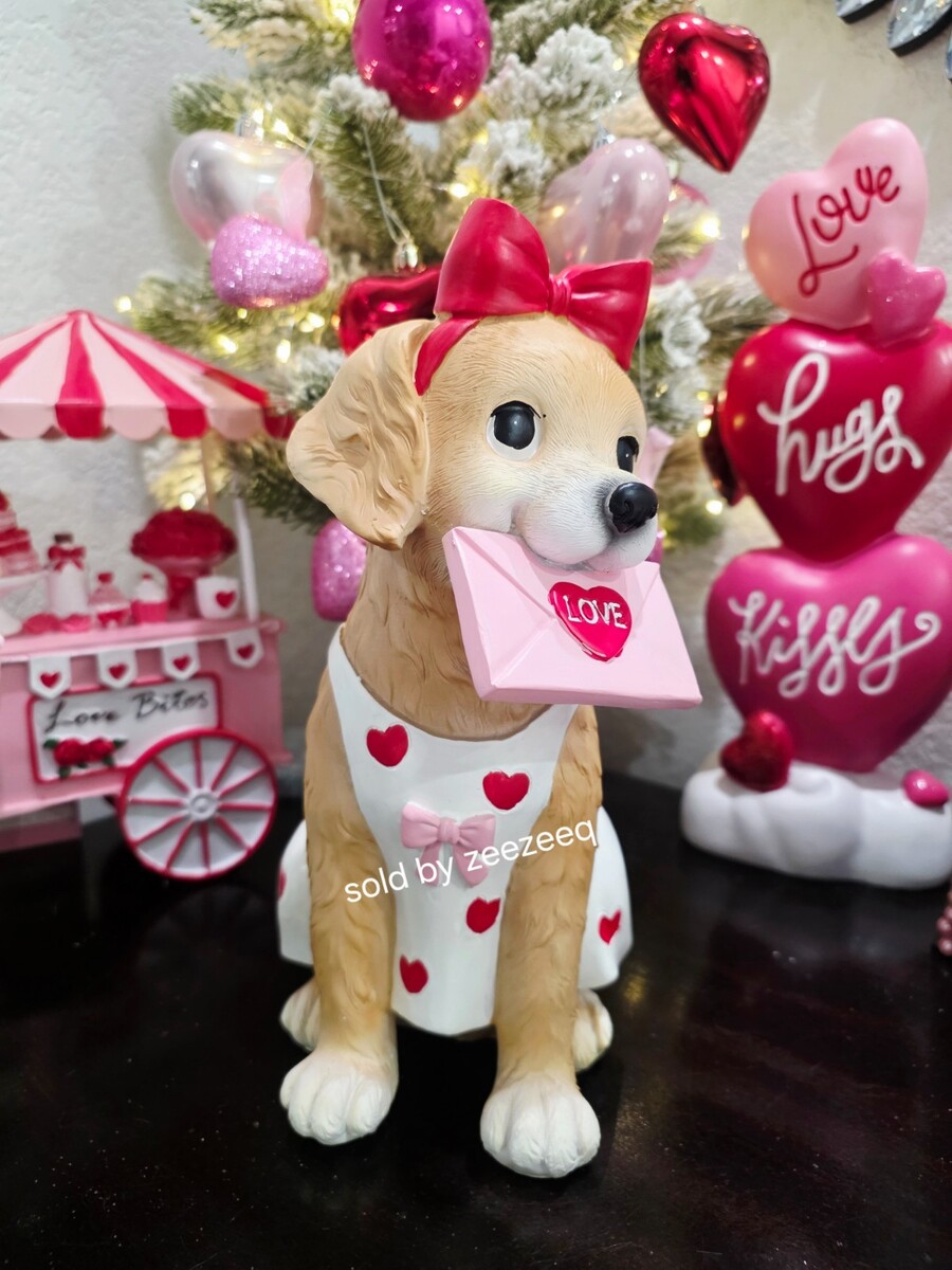 Up for sale we have this adorable Labrador for your Valentine's Day decor. This piece is sooo cute and it will look amazing with your decor. She is wearing a white dress with pink and red hearts and a red bow on her hair. She is too cute! Made of resin she measures approx 10" tall. NEW