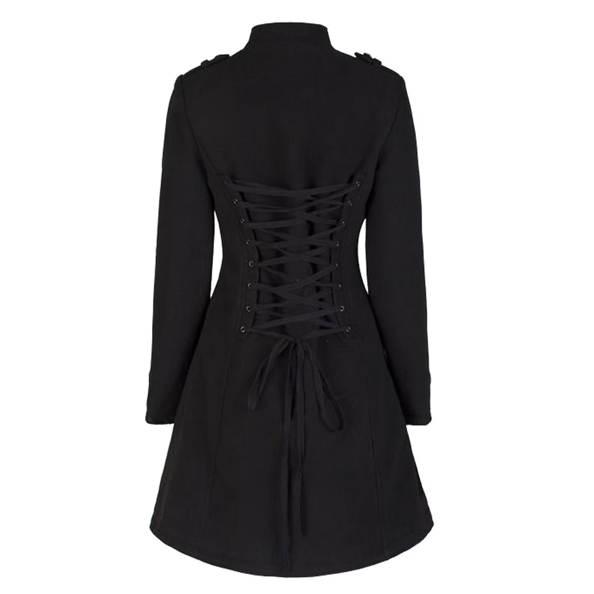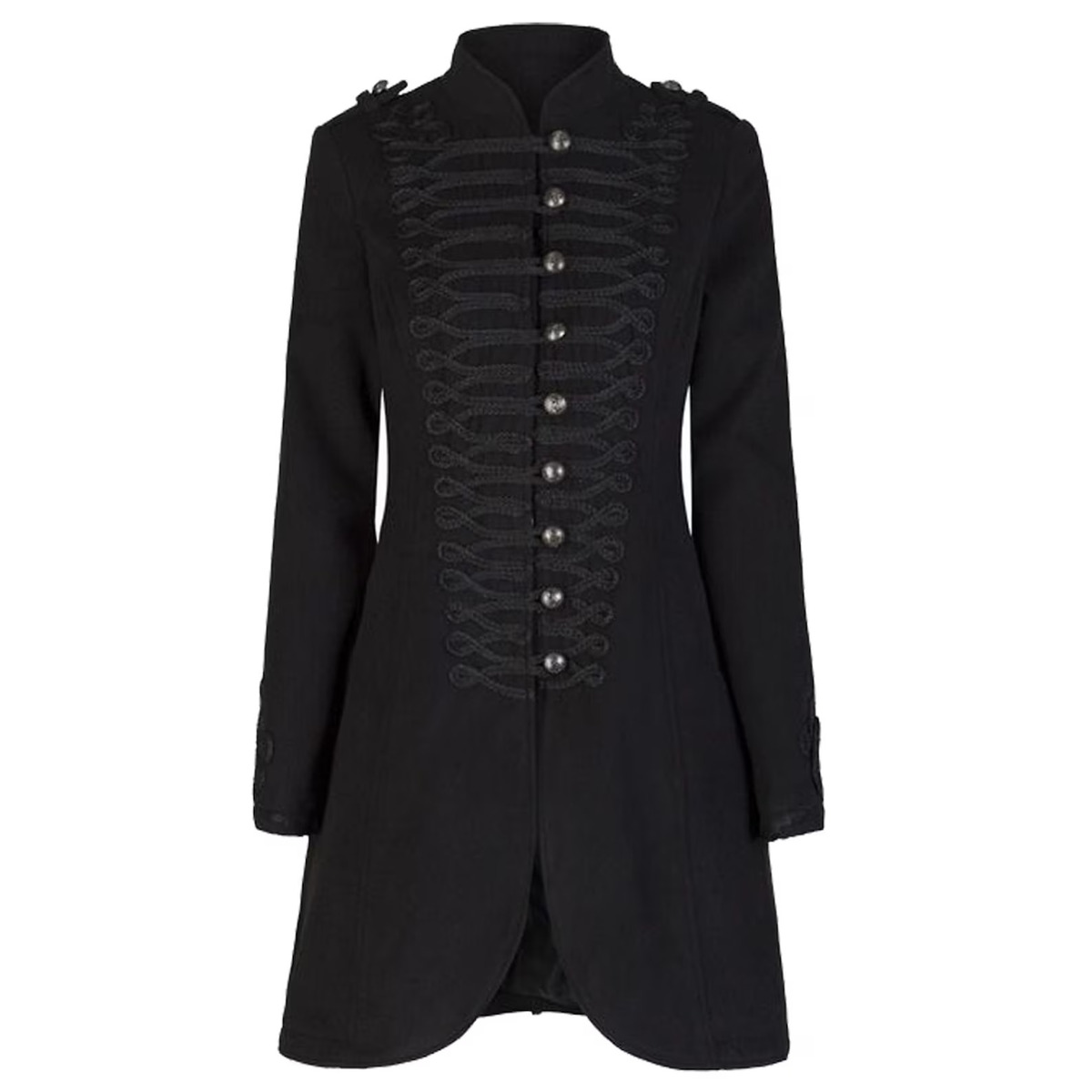 This women’s wool coat features a steampunk, military-inspired design with a sleek, tailored silhouette. Available in blush pink or classic black, it delivers a structured yet elegant look that stands out in alternative fashion. Finished with classic front button closures and a smooth polyester lining, it’s designed for comfort and easy wear. Cut as a long coat, it offers both warmth and style, making it a bold statement piece for gothic, steampunk, or alternative wardrobes.