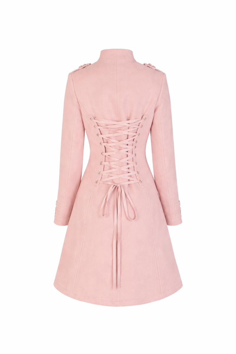 Women's Black and Pink Wool Coat Steampunk Military Style Long Coat w/ Lace-Up B