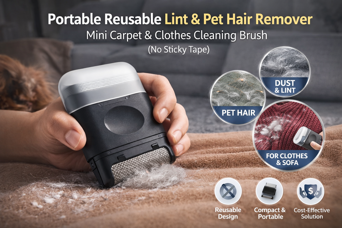Portable reusable lint and pet hair remover designed to quickly clean clothes, carpets, sofas, and bedding. No sticky tape needed. Compact, lightweight, easy to use, and eco-friendly. Perfect for daily home use and pet owners.