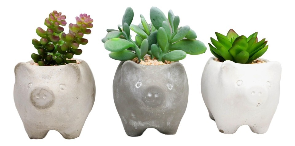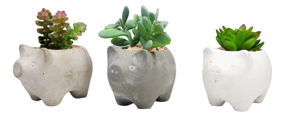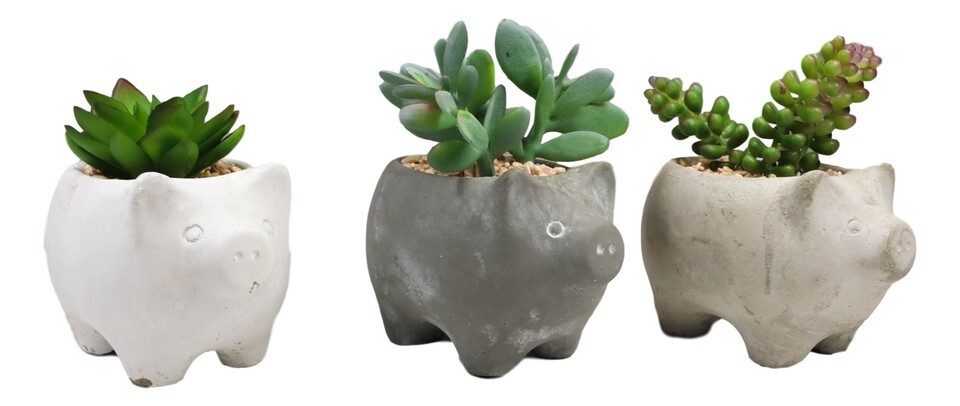 ? The Artificial Potted Greenery feature multi-tone green succulent plants set in rustic concrete-color pots. These vibrant potted faux plants look so real and you might feel the urge to water it! The pots come in 3 colors as pictured and are shaped like abstract animal farm pigs.