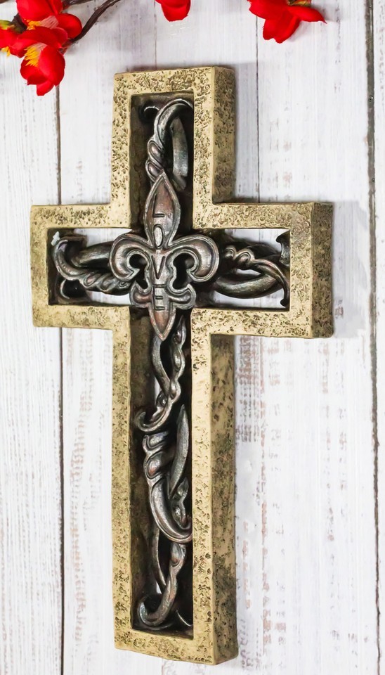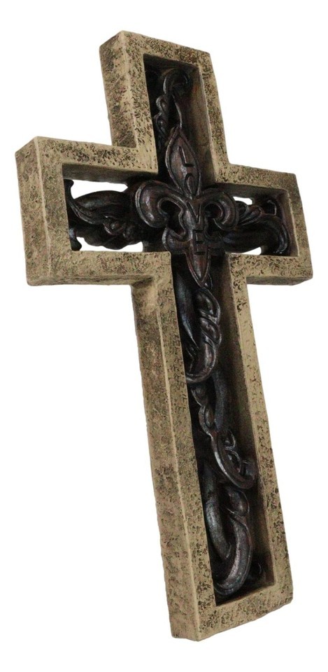 Rustic Faux Stone Fleur De Lis French Lily Scrollwork Tuscany Wall Cross