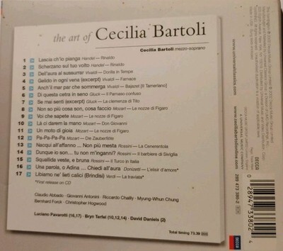The product is a CD titled "Art of Cecilia Bartoli" by classical artist Cecilia Bartoli, released in 2002 under the record labels IMT and Decca. This compilation of classical music by the renowned vocalist is a tribute to the artistry and talent of Cecilia Bartoli, showcasing her exceptional voice and musical abilities. With a focus on classical artists, this CD offers a collection of pieces that highlight the artistry and talent of Cecilia Bartoli in a high-quality audio format.