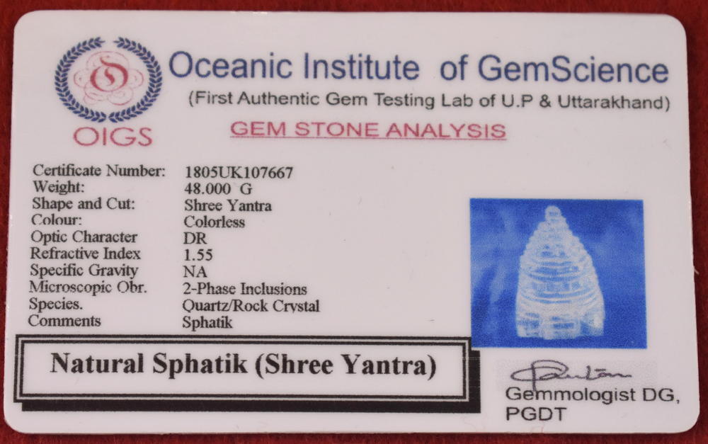 Sphatik Shree yantra / Quartz Crystal Shri yantra - 48 gm - Lab certified