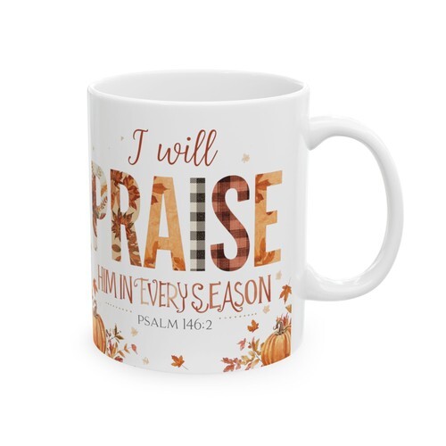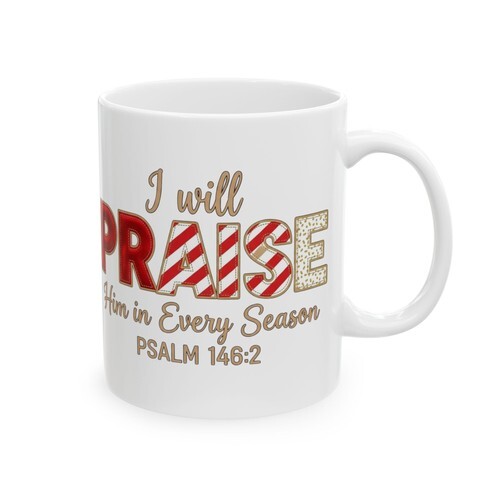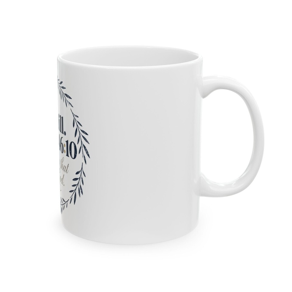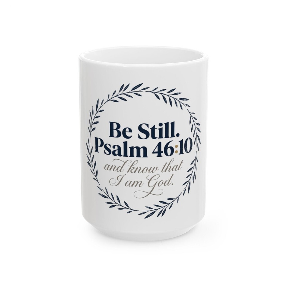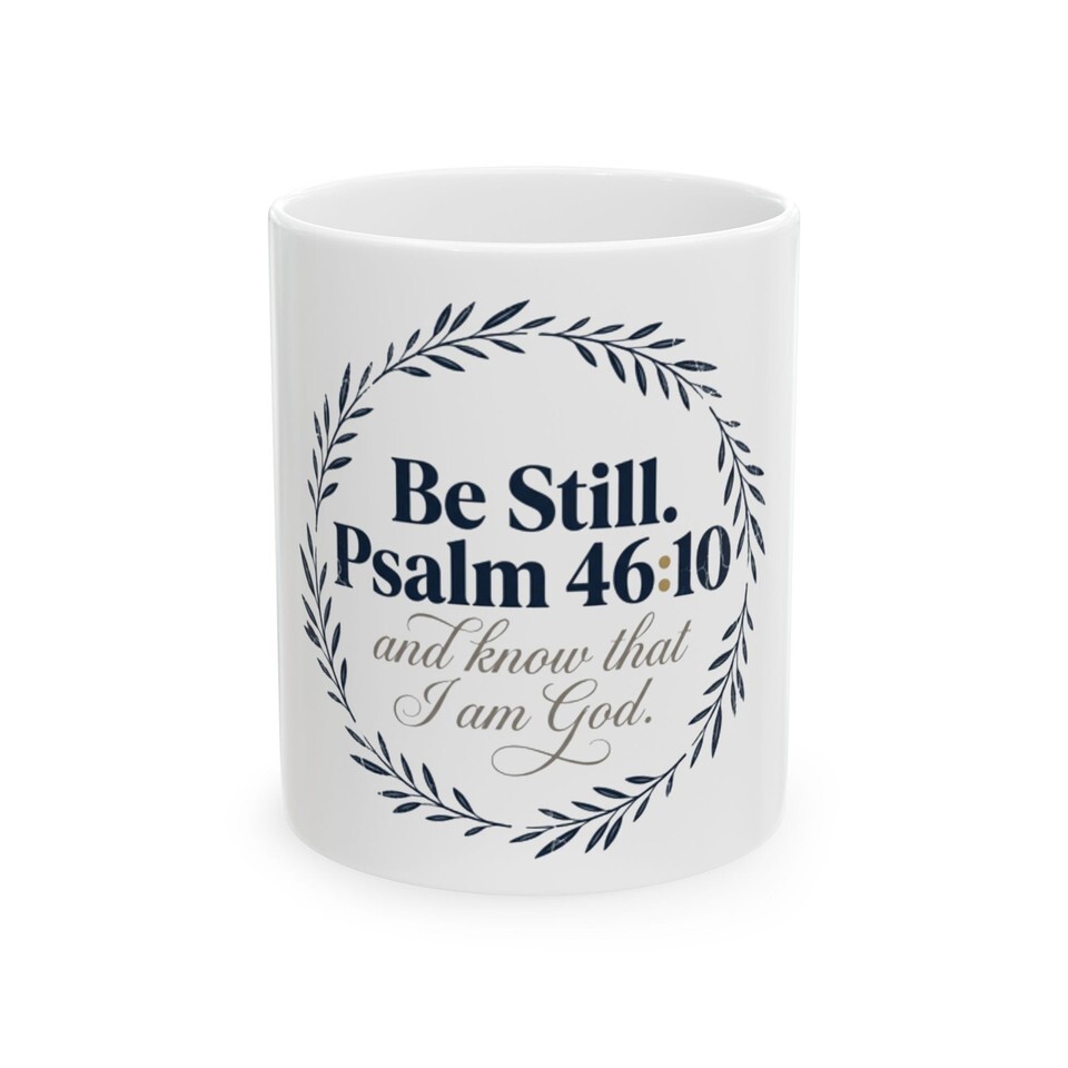 A calm, faith-centered mug that brings a quiet moment to the everyday. Soft navy lettering and a delicate wreath frame carry Psalm 46:10 ? ?Be Still...and know that I am God.? ? making morning coffee, afternoon tea, or a late-night pause feel like a gentle reminder to breathe and surrender. The glossy white ceramic creates a clean backdrop so the typography and wreath pop, while the comfortable C-handle makes it easy to hold during reflective moments. Keep it on your kitchen counter, church meeting table, or beside your Bible as a simple, steady presence in a busy day.
