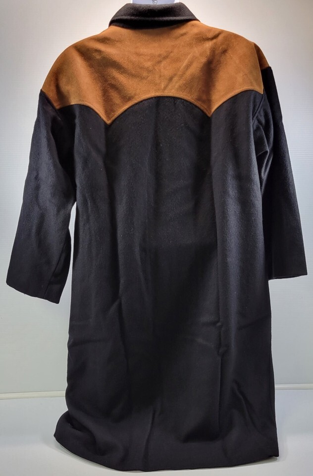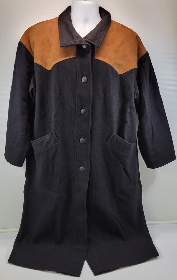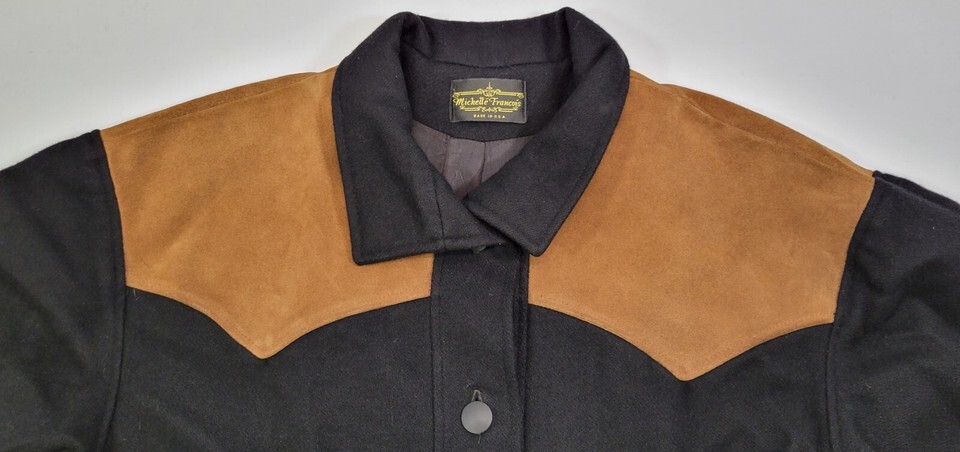 N) Vintage Michelle Francois Women Black Wool Coat Suede Shoulders USA