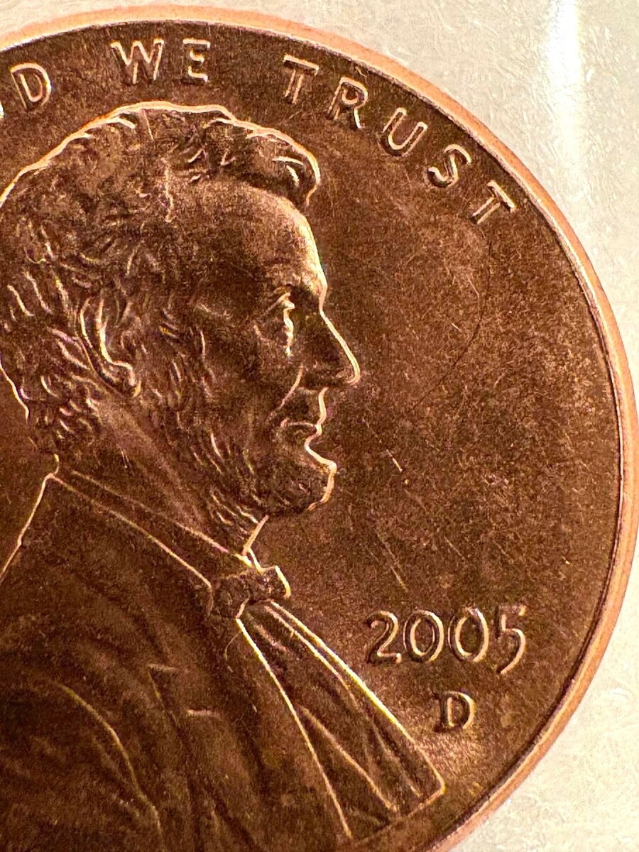 The product is a 2005 D Penny Close AM Rail RIM Variety coin from the United States.