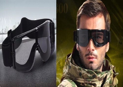 Goggles designed to protect the eyes from glare of sunlight and excessive light, such as emitted by tracer bullets and from dust and wind. They are generally shaped to have facial contact around the entire periphery of the frame, and held in place by a head band. They are designed for replacement lenses and may be furnished with one or more additional sets