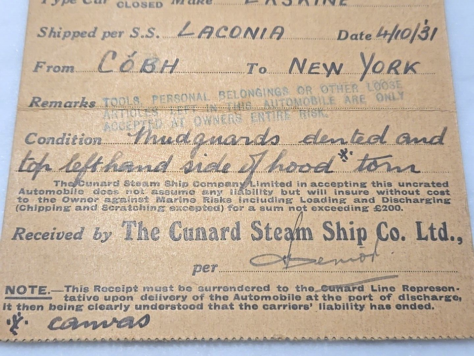 Up for bid is the owners (Mr. T. Quade) receipt for their car, (a Erskine) when it was shipped on a cruise from Liverpool via Queenstown to New York on April 10th, 1931.