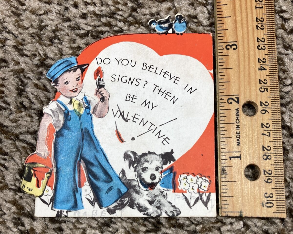 Vintage Valentines Day Card Boy Dog Painting Do You Believe in Signs