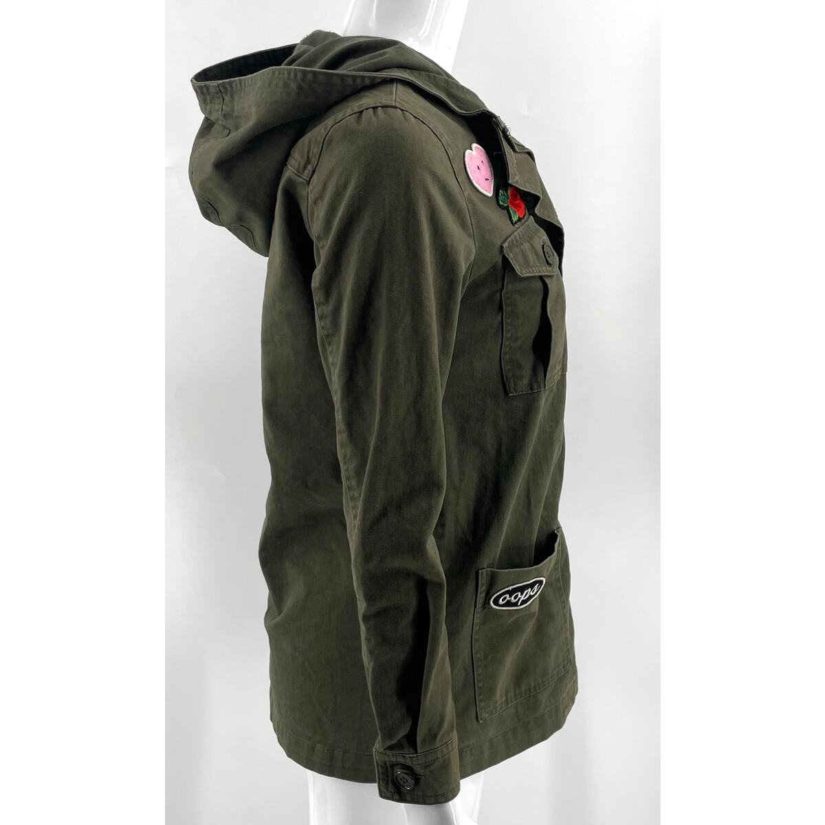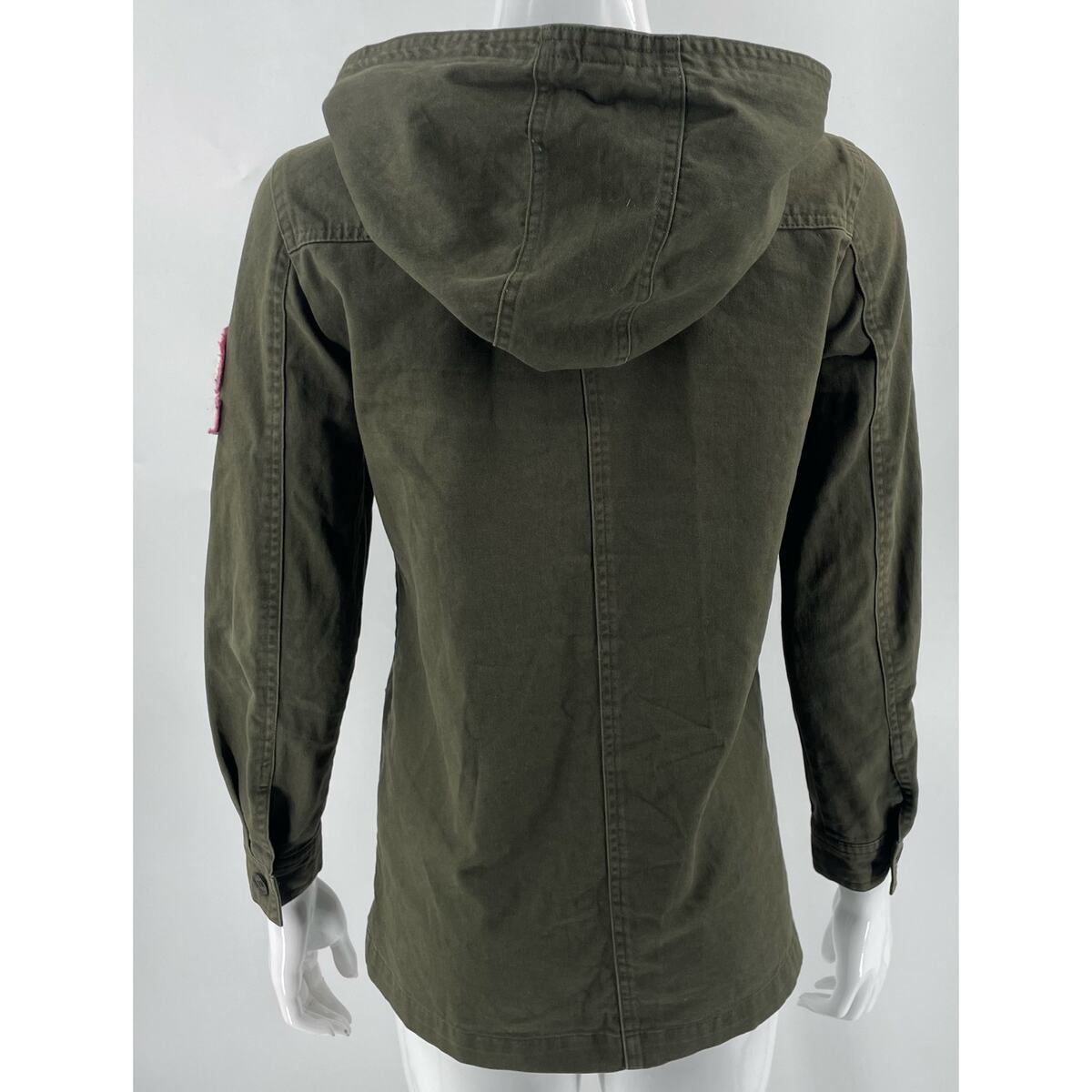 Forever 21 Womens Cargo Jacket Size Small Army Green Patches Zip Up Hooded
