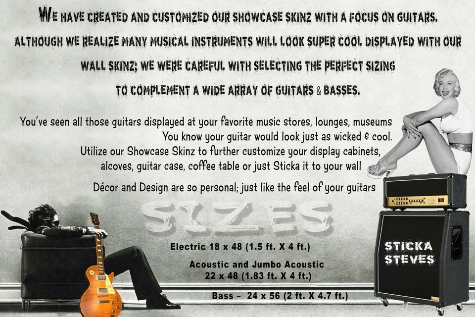 Utilize our Showcase Skinz to further customize your display cabinets, alcoves, guitar case, coffee table or just Sticka it to your wall.