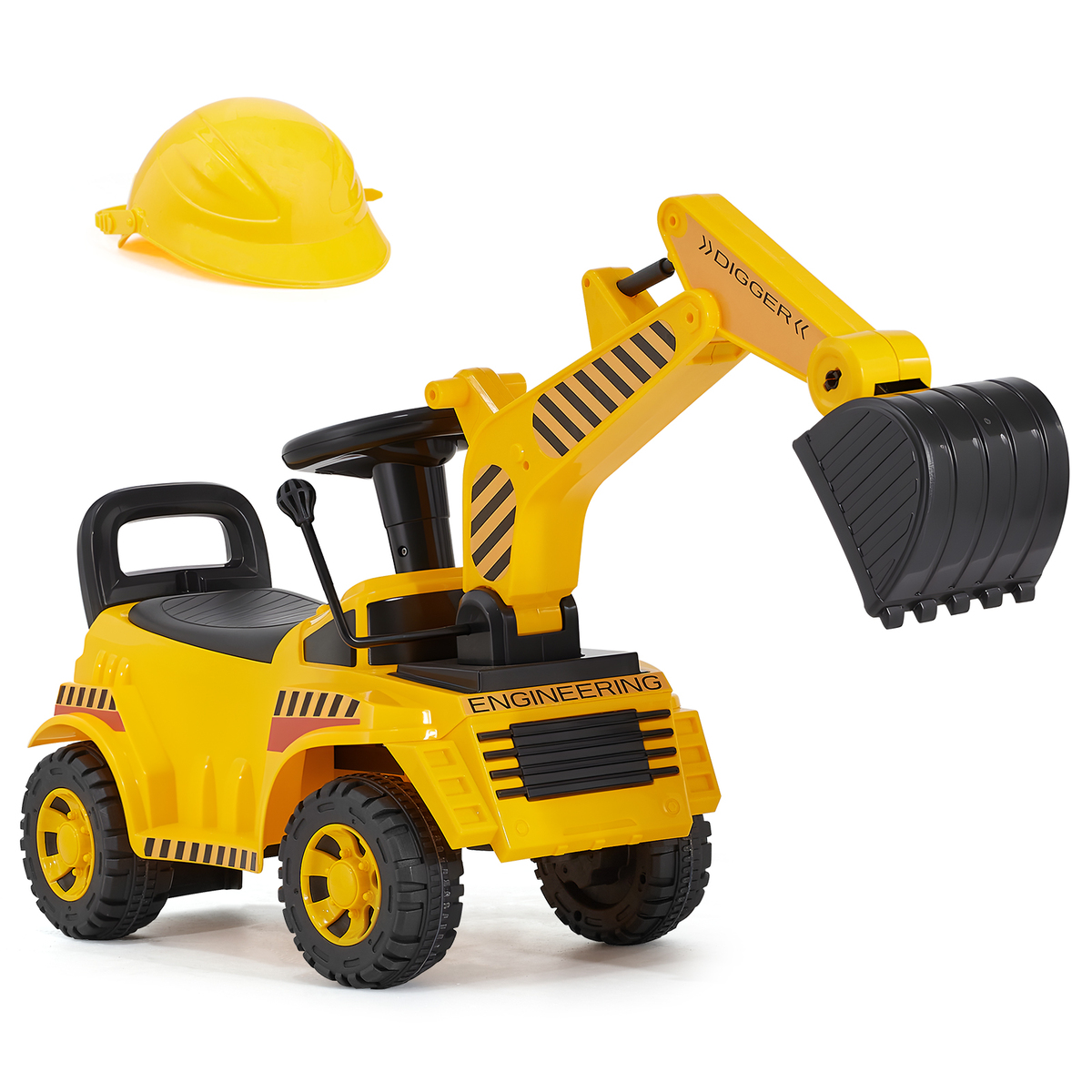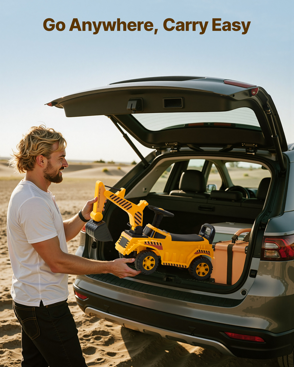 Mini Crane Operator: With the control lever, kids can raise and lower the digger arm, steer with the wheel, and enjoy realistic "Chug-chug" sounds. Complete with a security helmet, our ride on car is the ideal way to develop hand-eye coordination through play